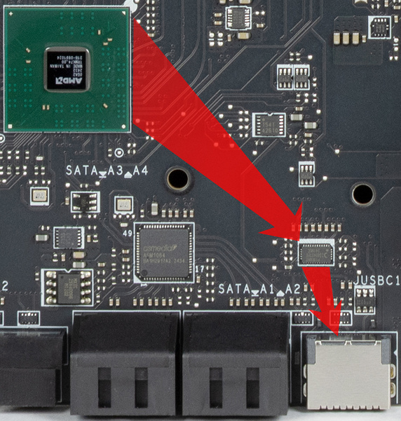 4 порта SATA 1,2,3,4 реализованы через хаб ASMedia ASM1064.