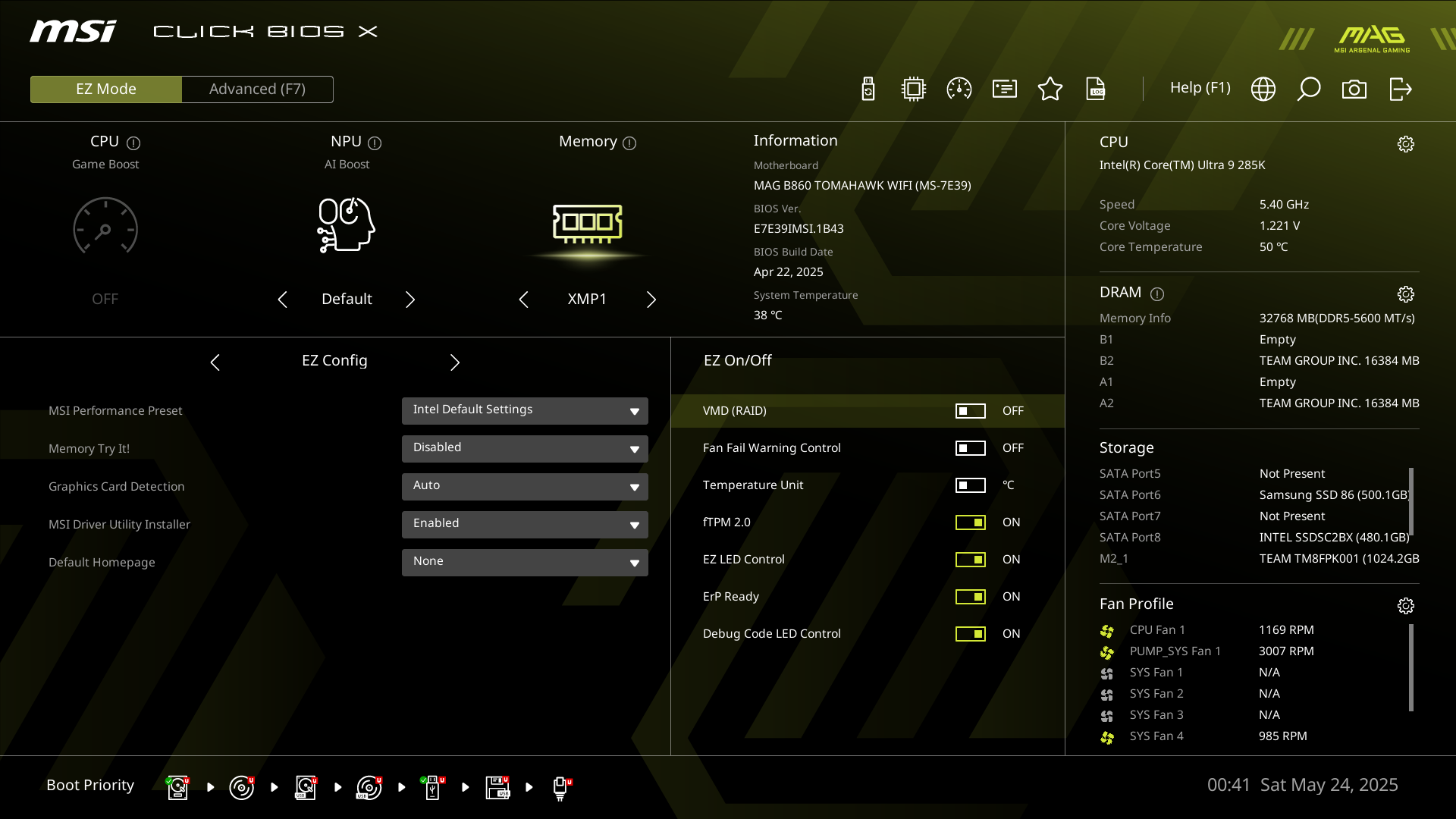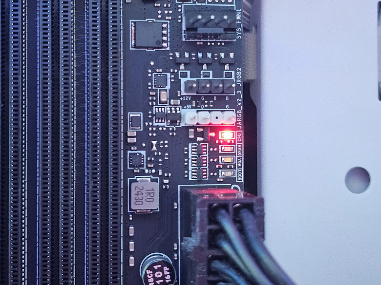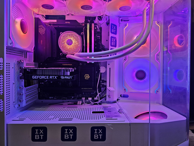 В арсенале платы также есть 4 порта SATA и 7 разъемов для вентиляторов. Система питания процессора хорошая, способная обеспечить работу даже топовых процессоров с разблокированным множителем с приличным запасом на разгон (но потребуется снизить завышенное напряжение на ядре процессора — надеемся, что в новой версии BIOS это будет исправлено). Плата имеет приличную систему охлаждения, все слоты M.2 имеют радиаторы. Сетевые возможности включают скоростной проводной контроллер 5 Гбит/с и один современный беспроводной — Wi-Fi 7 + Bluetooth 5.4. В числе плюсов платы можно упомянуть возможности для подключения дополнительных RGB-устройств.