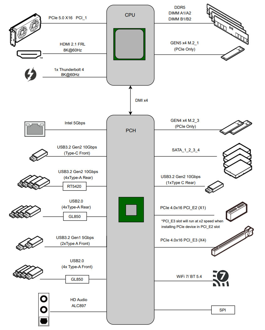 При этом взаимодействие с B860 идет по особому каналу Digital Media Interface 4.0 (DMI 4.0 x4). Serial Peripheral Interface (SPI) используется для взаимодействия с системой UEFI/BIOS, а шина Low Pin Count (LPC) — для связи с устройствами ввода/вывода, не требующими высокой пропускной способности (контроллерами вентиляторов, TPM, старой периферии). HDA более не используется, связь с аудиокодеками идет с помощью линий USB 2.0.