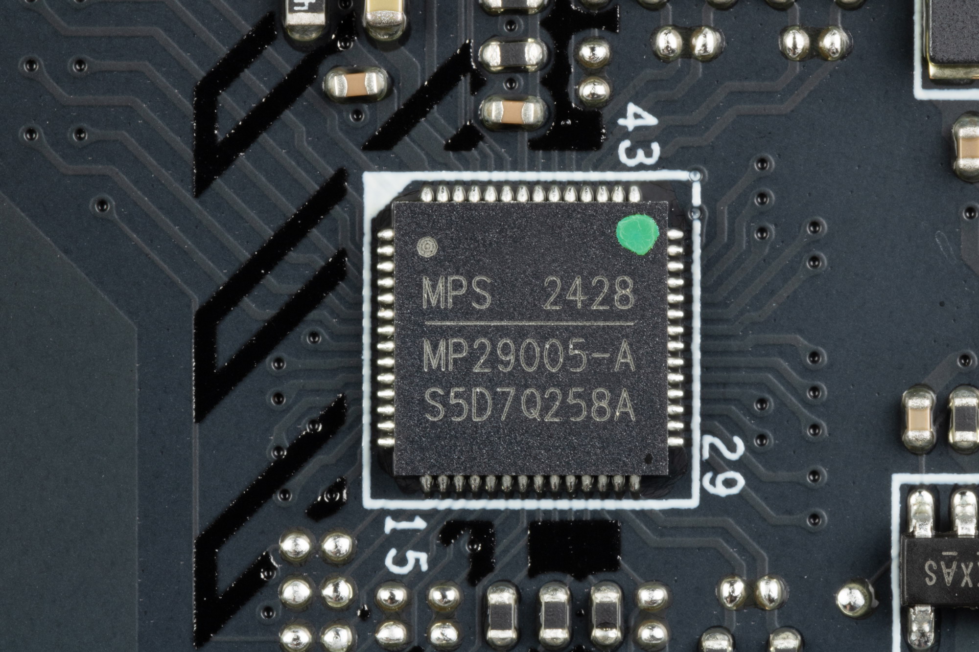 Управление этой схемой питания возложено на ШИМ-контроллер MP29005 от MPS (он поддерживает до 8х фаз, поэтому у нас идет параллельная схема управления фазами для VCore — 2x6 +1 фаза VCCSA и 1 фаза VNNAOM – всего 8 фаз).