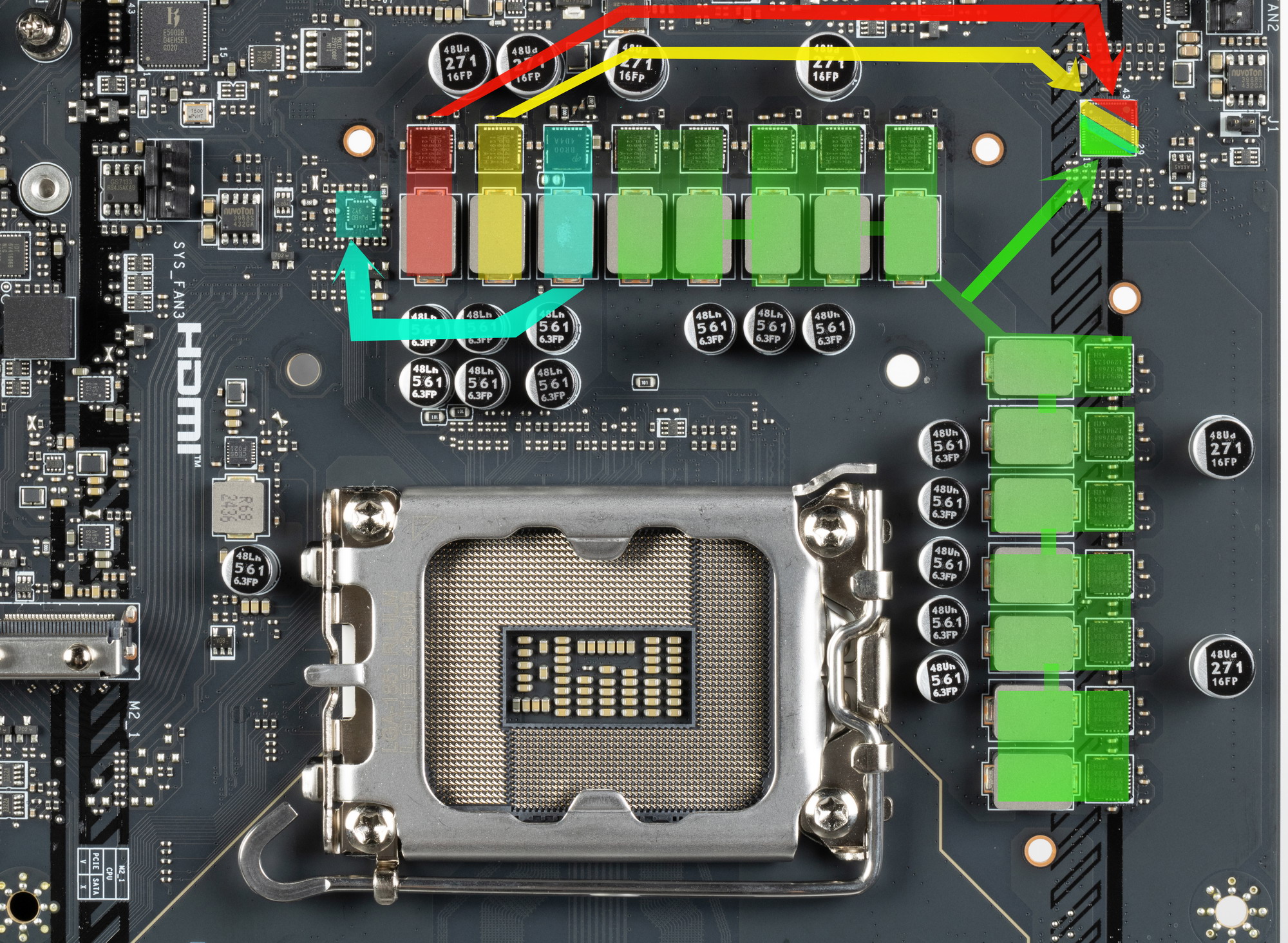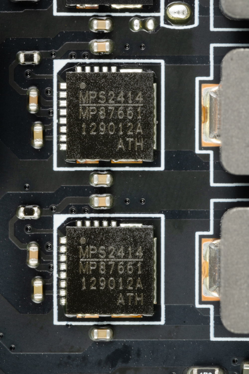 Каждый канал фазы VCore, VCCSA и VNNAOM имеет суперферритовый дроссель и MP87661 DrMOS от Monolithic Power Systems на 60 А.