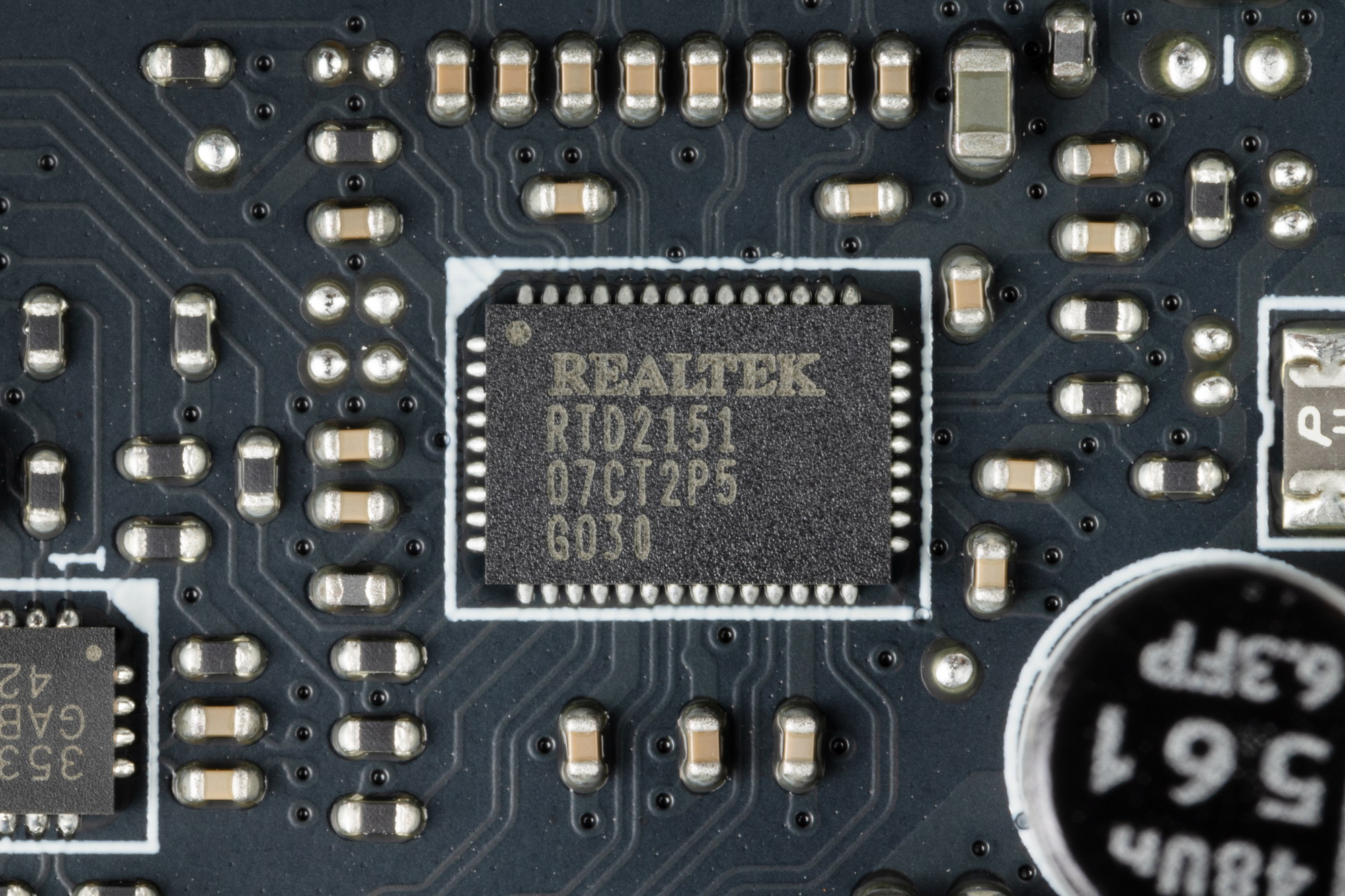 Аудиотракт вынесен на угловую часть платы, не пересекается с другими элементами. У платы на задней панели два универсальных разъема по приему и выводу сигналов плюс оптический S/PDIF.