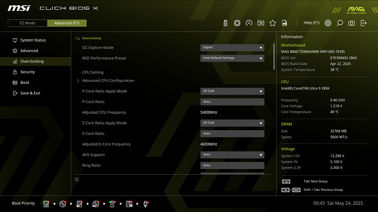 В режиме авторазгона мы получили до 5,3 – 5,4 ГГц по P-ядрам, и 4.6 ГГц по всем Е-ядрам. Напомню, что начиная с этого поколения процессоров, все ядра имеют по 1 потоку, то есть гипертрейдинга (многопоточности) теперь нет. Потребление процессора достигало 212 Вт. К сожалению, здесь мы наблюдаем чуть завышенный вольтаж VCore, поэтому процессор (несмотря на усиленное охлаждение) иногда входил в тротлинг, перегреваясь выше 100 °С. Отмечу, что профиль в BIOS – тот, что рекомендует Intel, так что, скорее всего, недоработка программистов MSI, некорректно реализовавших данный профиль настроек.