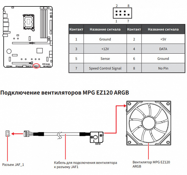 В комплект поставки входят: краткое руководство пользователя (детальное можно скачать с сайта производителя), два кабеля SATA, адаптер-удлинитель EZ Conn V1 для подключения вентиляторов MSI к проприетарному гнезду JAF_1, адаптер EZ Front Panel Cable для удобного подключения кабелей от корпуса к матплате, ключ для смены стоек в слотах M.2 и антенна встроенного Wi-Fi-модуля.