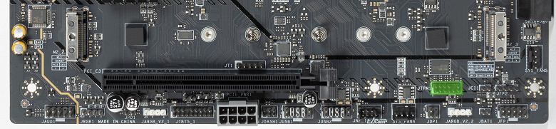 Всего на плате есть 3 слота: слот PCIe x16_1 (PCI_E1 для видеокарт или других устройств), слот PCIe x1 (PCI_E2) и «длинный» PCIe x16_2 слот (PCI_E3, но фактически имеющий 4 линии PCIe 4.0). PCI_E2/E3 делят линии между собой: при занятости PCI_E2 слот PCI _E3 получает не 4, а всего 2 линии PCIe 4.0, и наоборот, при занятости последнего (4 линии PCIe 4.0), слот PCI_E2 отключен.