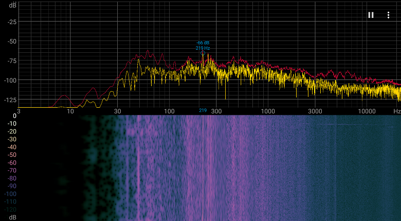 В целом, если сравнивать, например, с типичным игровым ноутбуком, то этот ПК не является шумным устройством. Характер шума особого раздражения не вызывает, хотя какой-то жужжащий призвук присутствует. Спектрограмма, полученная для максимальной нагрузки, достаточно ровная, есть только один выраженный пик (на 219 Гц), но интенсивность его низкая: