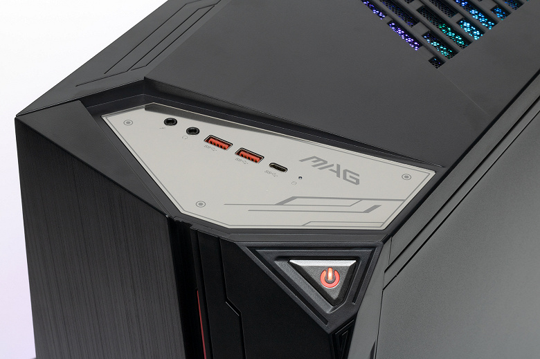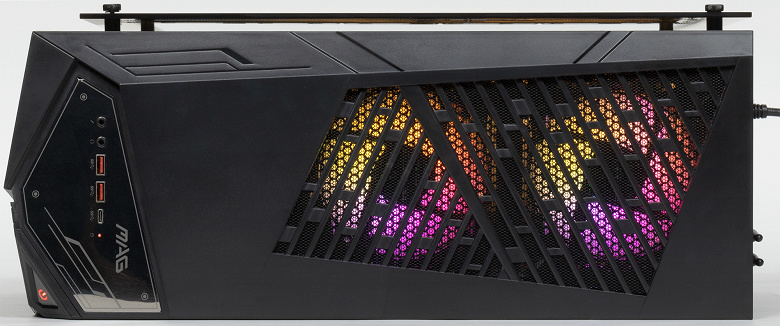 Основное, что светится — вентиляторы. Включая и пару на верхней грани корпуса, которая часто будет видна, поскольку рассчитан компьютер больше на установку на пол или низкую полку в столе. Тоже олдскул по большому счету, хотя и не слишком сочетающийся со стеклянными крышками. А почему мы вообще так решили? Потому, что для настольной установки порты должны быть на лицевой поверхности корпуса — и не слишком высоко. А тянуться к верхней грани полноразмерного десктопа сидя не слишком удобно, втыкать туда что-то вслепую — тем более, но других удобнодоступных портов у компьютера нет. Зато набор из трех USB3 Gen2 (один из которых — Type-C) и наушников с микрофоном как раз для быстрого доступа необходим и достаточен. Но расположен таким образом — подталкивающим, повторимся, к установке компьютера на полу — в этом случае все под рукой. Там же на блестящей панельке и индикатор дисковой активности — давно уже не слишком нужный рудимент из прошлого, но, раз уж есть, обязан быть на виду.