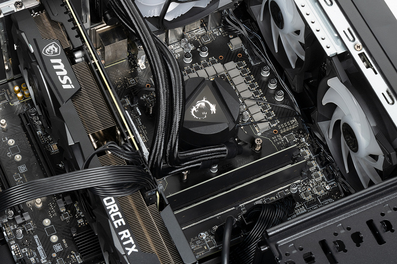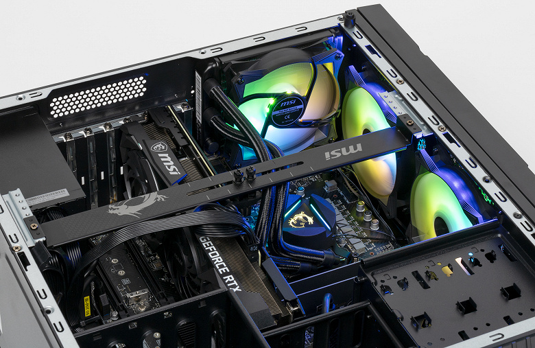 Конечно, в какой-то степени мы придираемся — все-таки это готовый ПК, а не корпус, который придется наполнять самостоятельно. К тому же и покупают компьютеры с RTX 3070 или 3080 не для того, чтоб вскоре их апгрейдить — а за несколько лет может произойти много всего. Но могло бы быть лучше — переработай компания дизайн корпусов этой серии. Тем более, длинные громоздкие видеокарты сюда так и просятся — благодаря дополнительной «распорке», позволяющей их поддерживать безо всяких смешных подпорок.