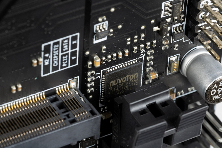 Еще у этой модели 4 порта SATA и 8 разъемов для вентиляторов. Система питания процессора довольно мощная и способна обеспечить работу любых совместимых процессоров с некоторым запасом на разгон. Сетевые возможности хорошие: быстрый проводной контроллер 2,5 Гбит/с, а также один самый современный беспроводной. В числе плюсов платы можно упомянуть возможности для подключения RGB-устройств подсветки.