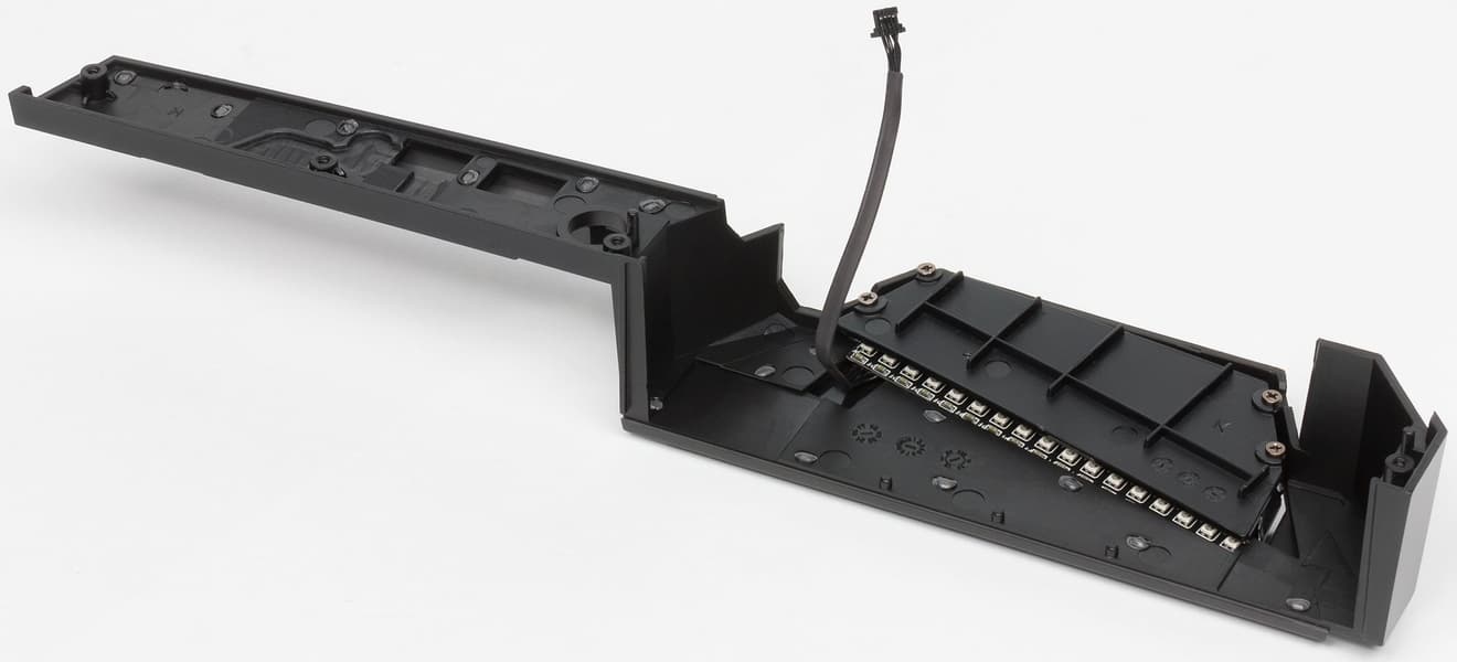 Над аудиоподсистемой и над блоком разъемов задней панели установлен пластиковый кожух соответствующего дизайна и с подсветкой, радиаторов там нет.