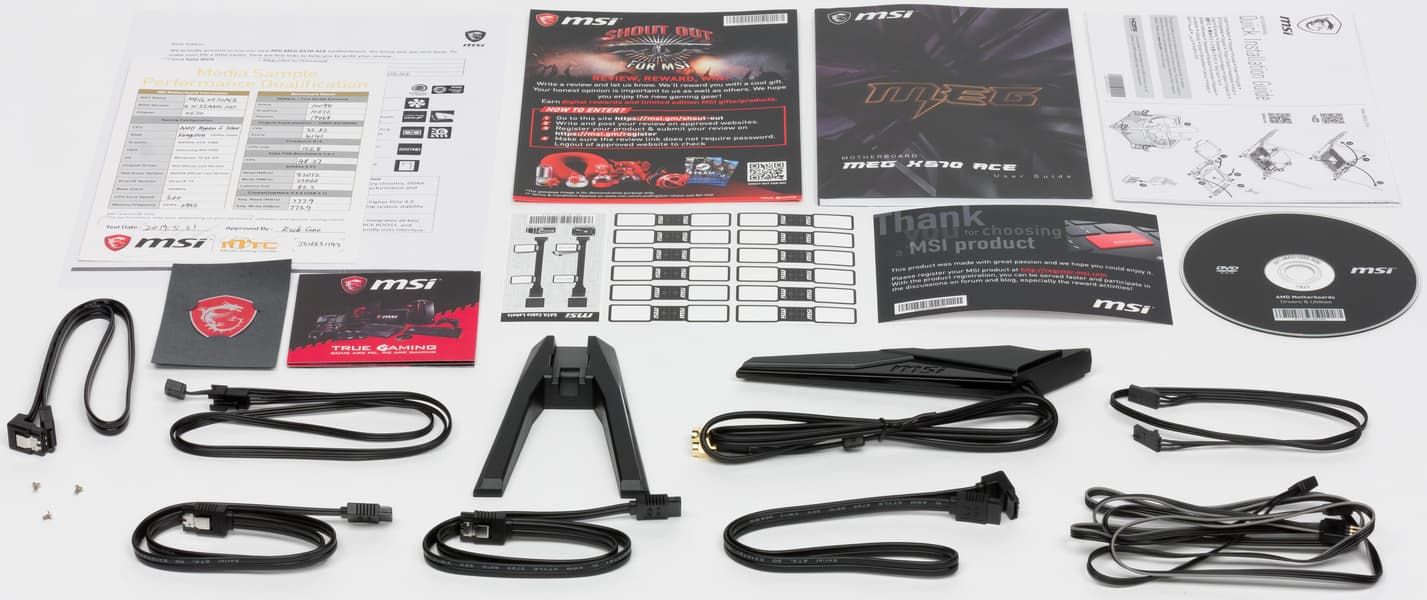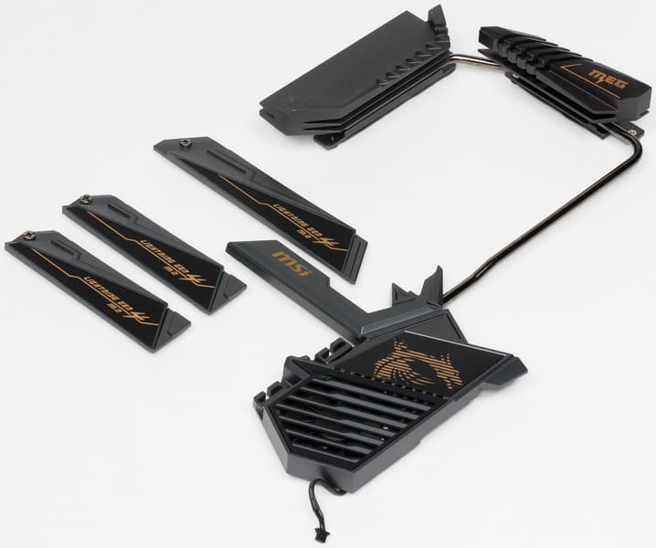 Комплект поставки, кроме традиционных элементов типа руководства пользователя, диска и кабелей SATA (что уже много лет является обязательным набором ко всем материнкам), есть выносная антенна с подставкой для беспроводных соединений, разветвители для подключения подсветки, винтики для монтажа модулей M.2, бонусные стикеры и наклейки. Весь комплект (кроме бумажек) помещен в фирменный тканевый мешок.