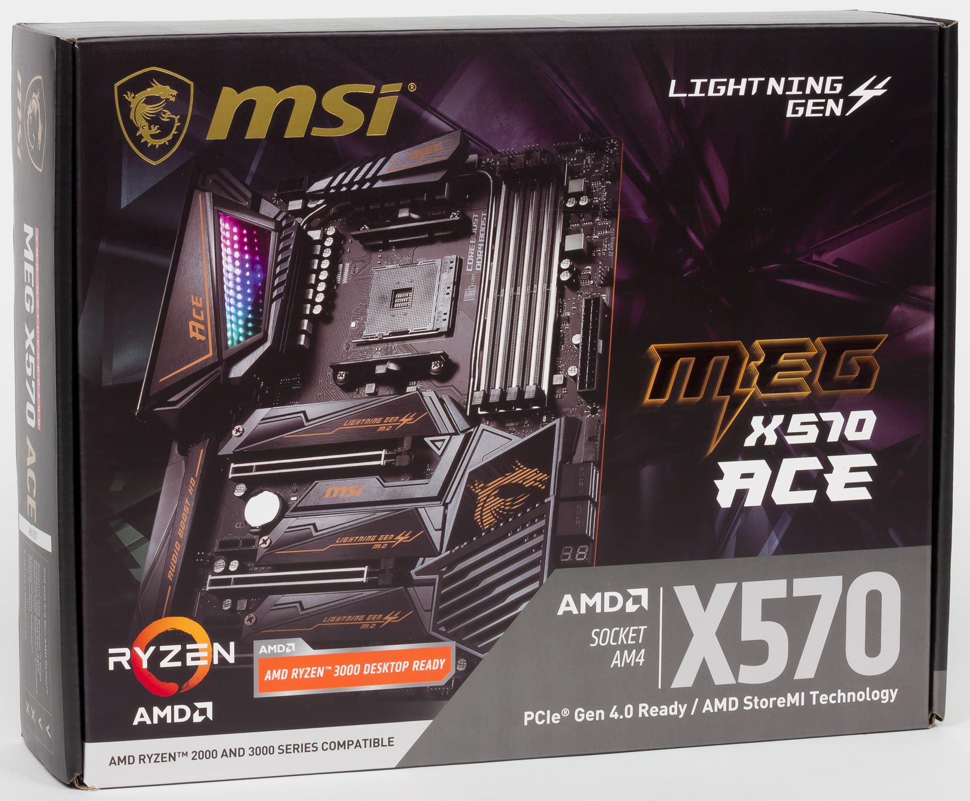 MSI MEG X570 Ace поставляется в большой, но обычной коробке без излишеств.. Учитывая любовь MSI к слову Lighting, уже нет удивления, что новую быструю шину PCI-E v.4.0 в части работы с накопителями M.2 (PCI-E интерфейс) в компании назвали по-своему Lighting Gen 4.