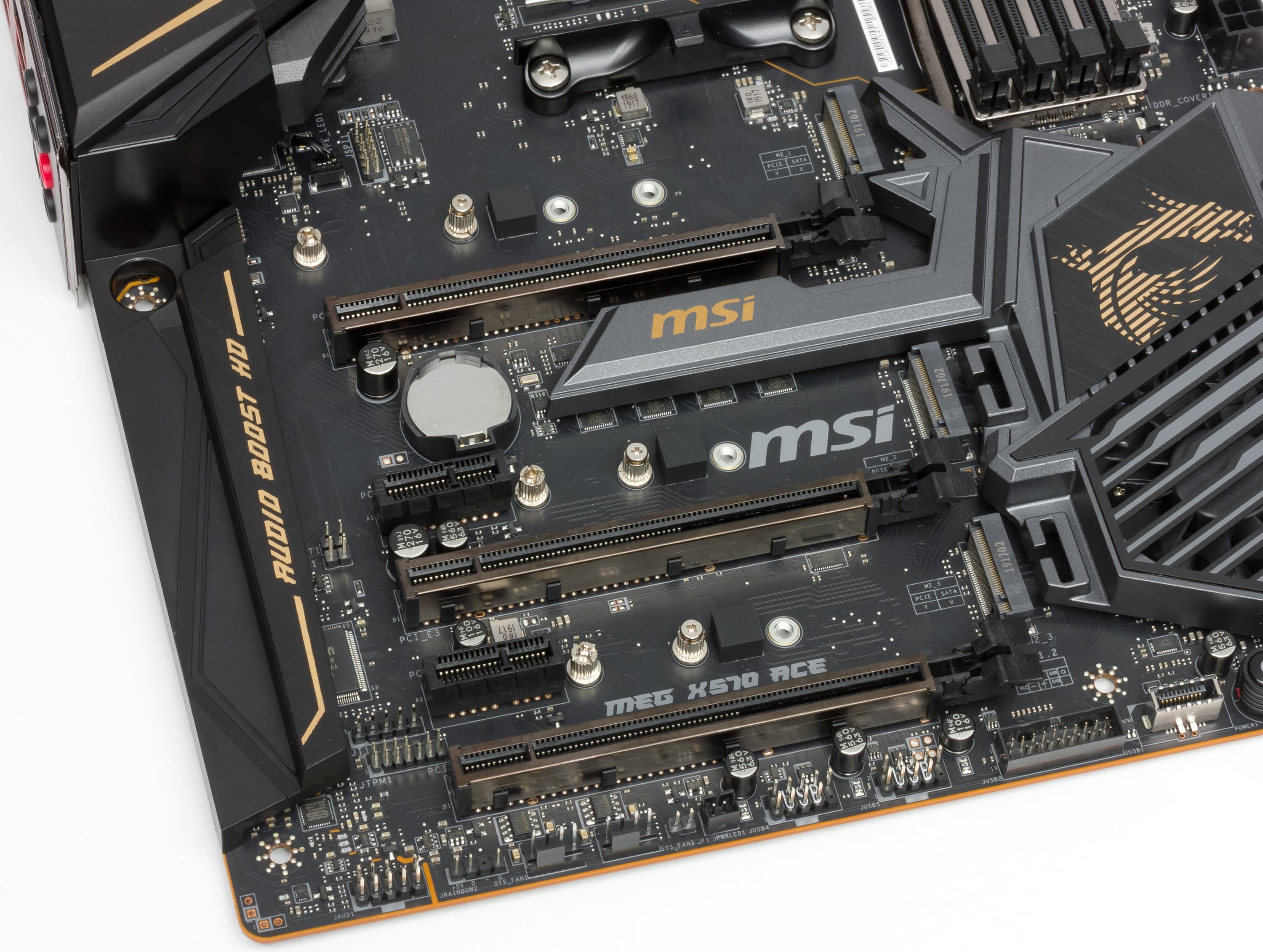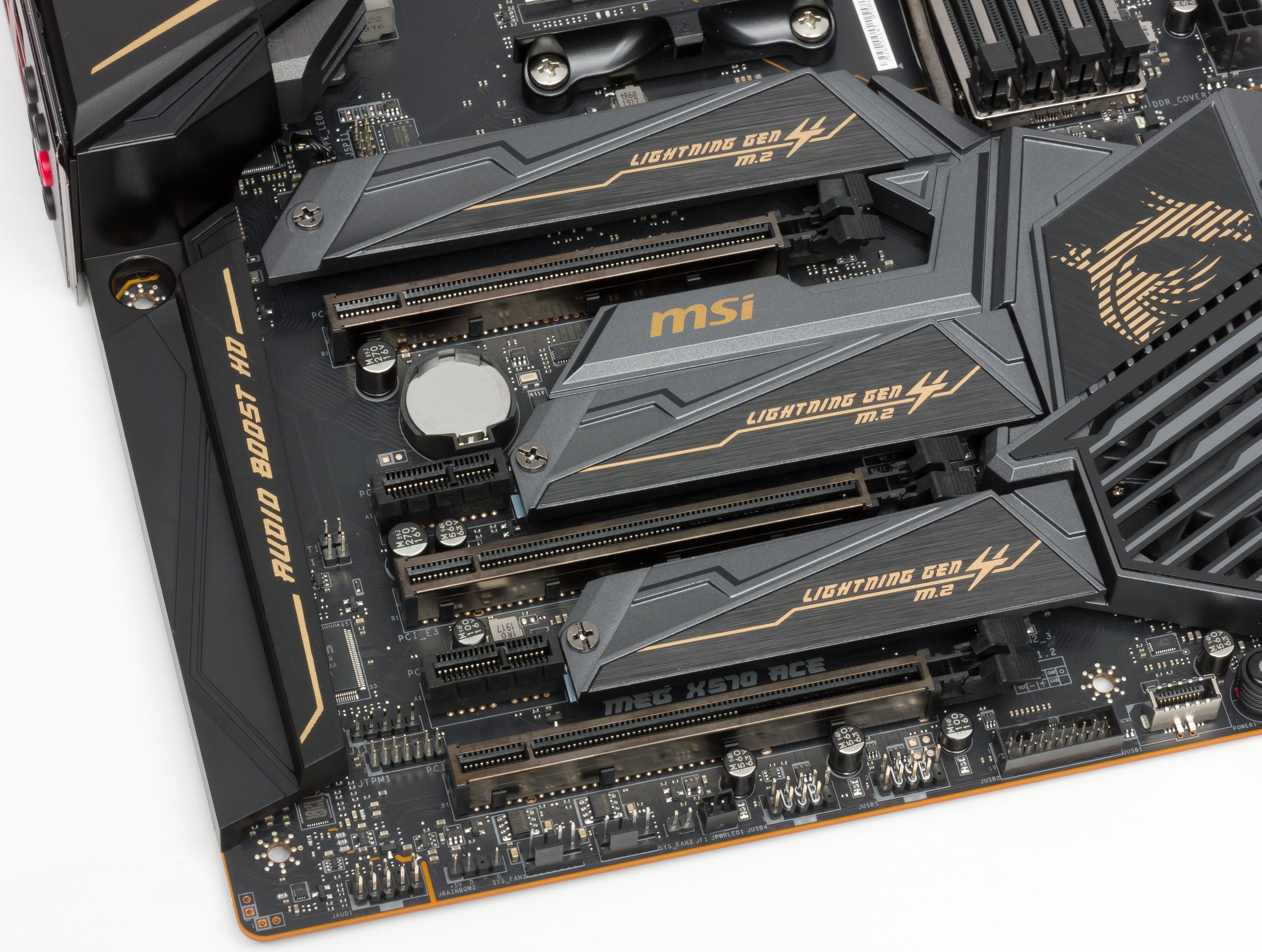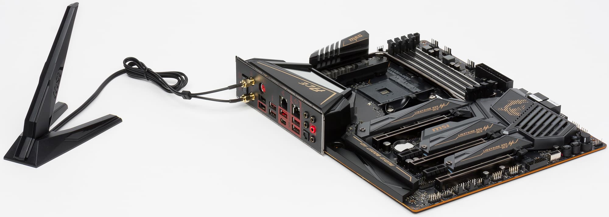 По идее, также хочется сказать, что еще имеется стандартный видеовыход (HDMI или DP), ведь у ряда Ryzen 2xxx имеется встроенное видеоядро, однако из-за того, что во-первых, все же материнские платы на X570 предназначены все же для Ryzen 3xxx (причем топовой линейки, а с интегрированной графикой среди таковых на сегодня нет), во-вторых, даже если представить, что кто-то захочет использовать Ryzen 2200/2400G (с графикой), то очень глупо сочетать дешевые CPU с материнской платой премиального сегмента (да еще и делать разводку на печатной плате дорожек видеовыводов). Ну примерно вот по этим соображениям в компании MSI и решили, что для такой серьезной материнской платы гнезда вывода на мониторы не нужны.