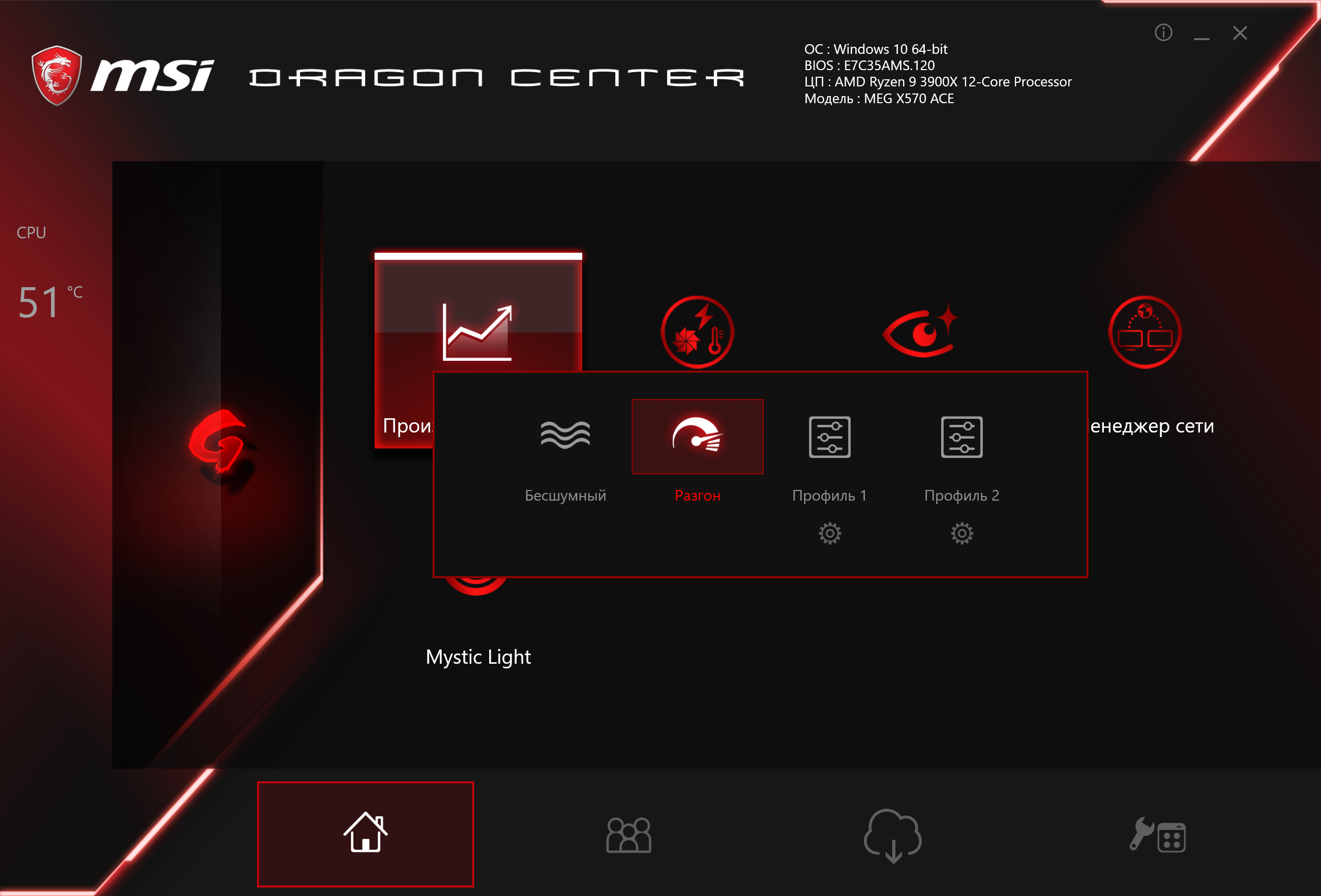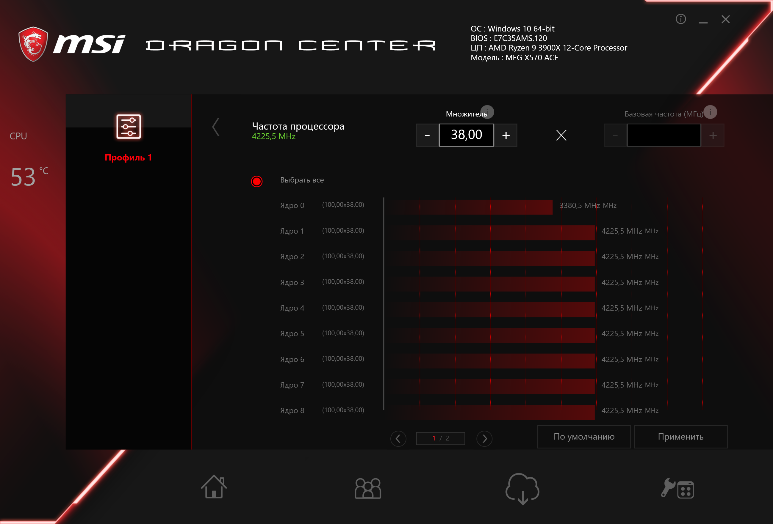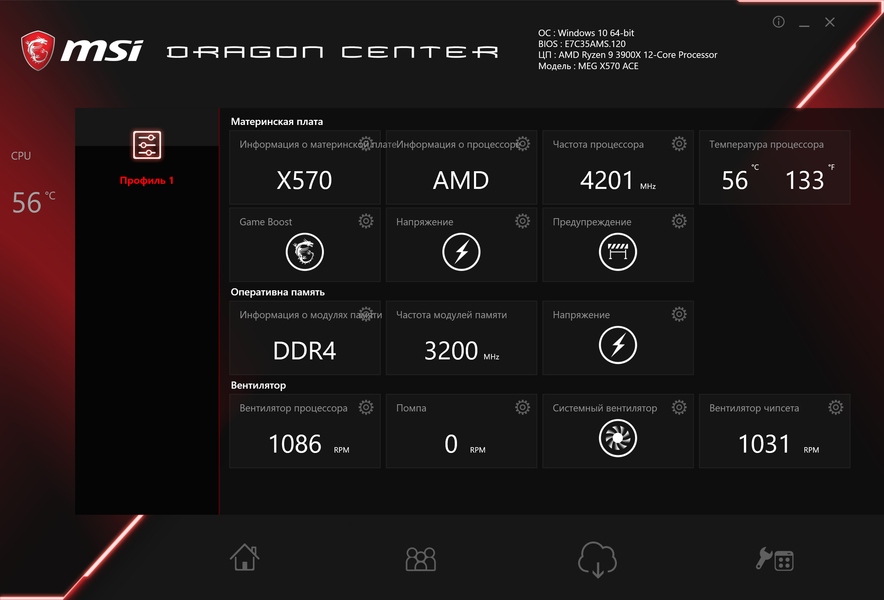Плата MSI MEG X570 Ace по меркам премиального сегмента относительно дешева, хотя это понятие условное: на момент написания материала она имела цену около 26-28 тысяч рублей, и понятно, что многим это покажется чрезмерно дорого. При этом у нее отменная функциональность: 17 портов USB всех калибров, прекрасно защищенные слоты PCI-E, три слота M.2 (поддерживающие PCI-E 4.0!). Разумеется, производительность самих новых Ryzen мы в обзоре оставили за скобками (от материнской платы она почти не зависит). Стоит отметить очень хорошую систему питания, дающую ощутимый запас для разгона и обеспечивающую гибкие возможности регулирования напряжений (программа AMD Ryzen Master тестирует это при запуске режима разгона). 7 разъемов для вентиляторов позволяют организовать какую угодно систему охлаждения ПК, при этом есть гибкая система контроля за работой каждого вентилятора! Еще в плюсы надо добавить красивую подсветку самой платы, включая широкие возможности для подключения дополнительных RGB-устройств, в том числе проприетарные решения Corsair. Можно упомянуть и поддержку быстрой зарядки мобильных гаджетов через порты USB Type-C. Поддержка со стороны программного обеспечения также хороша: универсальное приложение Dragon Center обеспечивает широкие возможности настройки работы и контроля за состоянием самой платы и системного блока в целом.