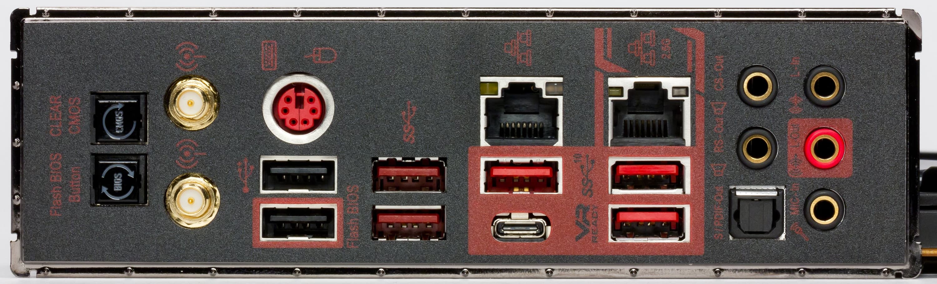 | Разъемы на задней панели | 1 × USB 3.2 Gen2/1 (Type-C) 1 × USB 3.2 Gen2/1 (Type-A) 2 × USB 3.2 Gen2 (Type-A) 2 × USB 2.0 (Type-A) 2 × RJ-45 1 комбинированный разъем PS/2 5 аудиоразъемов типа миниджек 1 × S/PDIF (оптический, выход) 2 антенных разъема кнопка сброса CMOS кнопка перепрошивки BIOS — FlashBIOS |