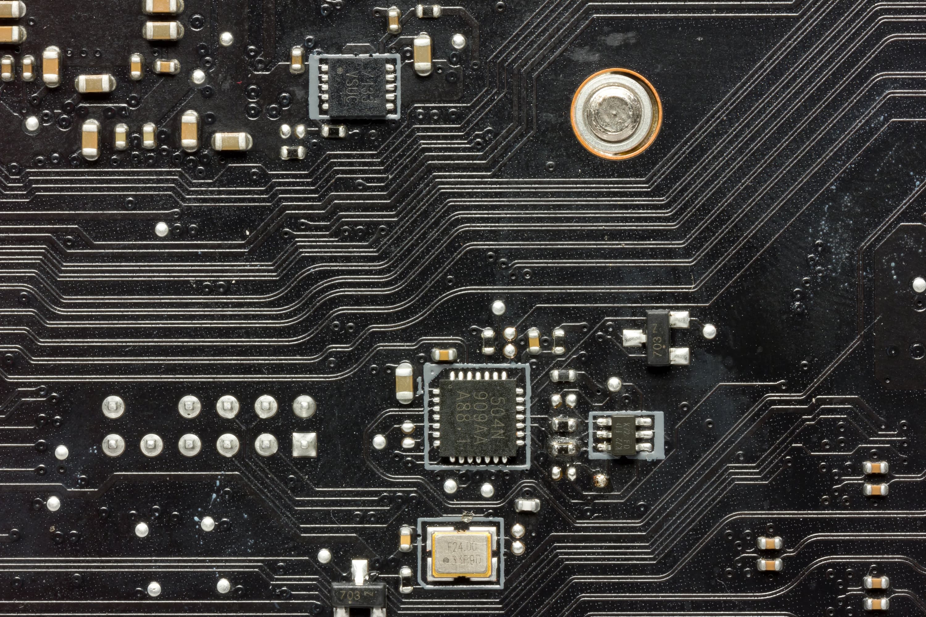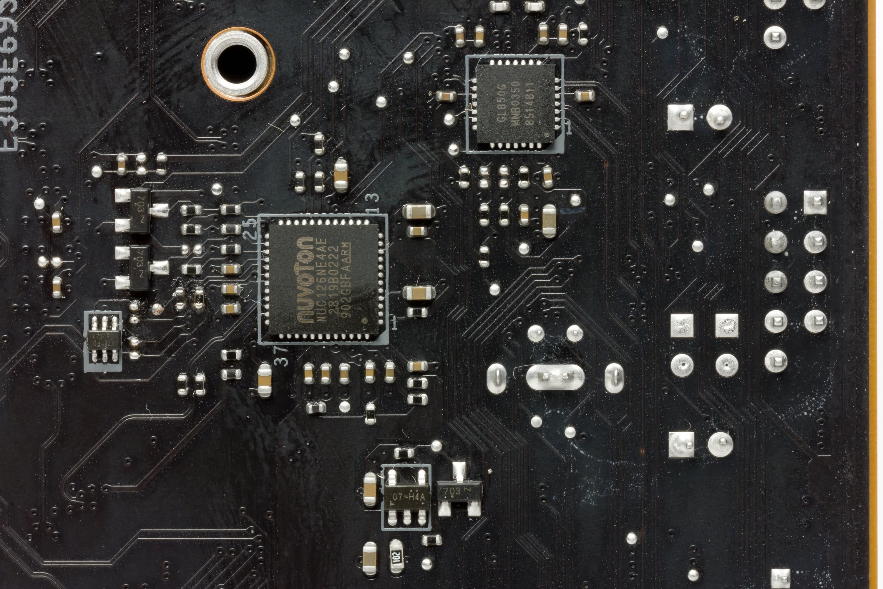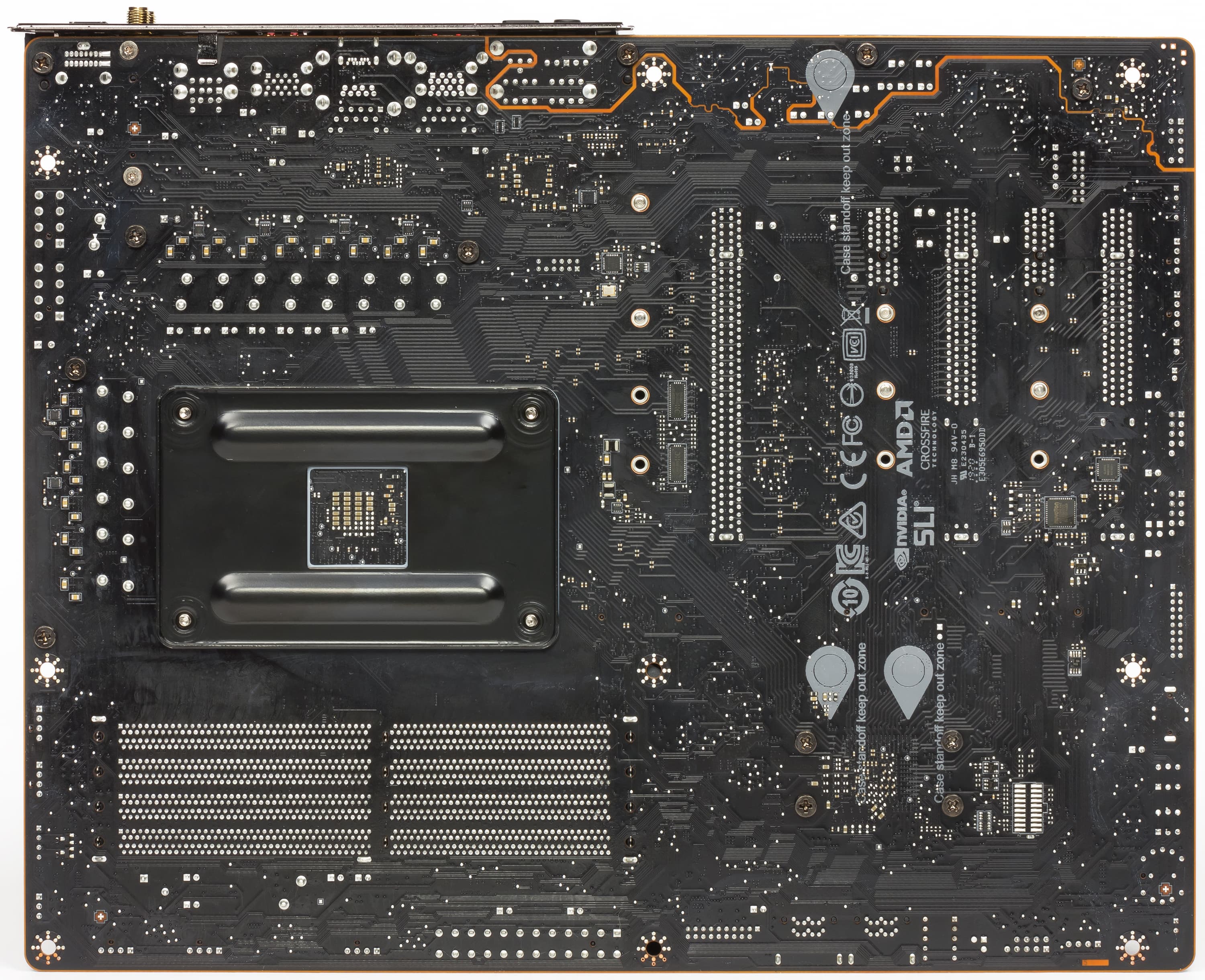 На оборотной стороне мало элементов, там размещены удвоители фаз питания и иная мелкая логика. Обработан текстолит хорошо: во всех точках пайки острые концы срезаны. Серые «капли» на текстолите означают, что на несущей плате корпуса в этом месте могут быть втулки крепления, то есть перед монтажом материнки следует убедиться, что втулки из этих мест удалены.