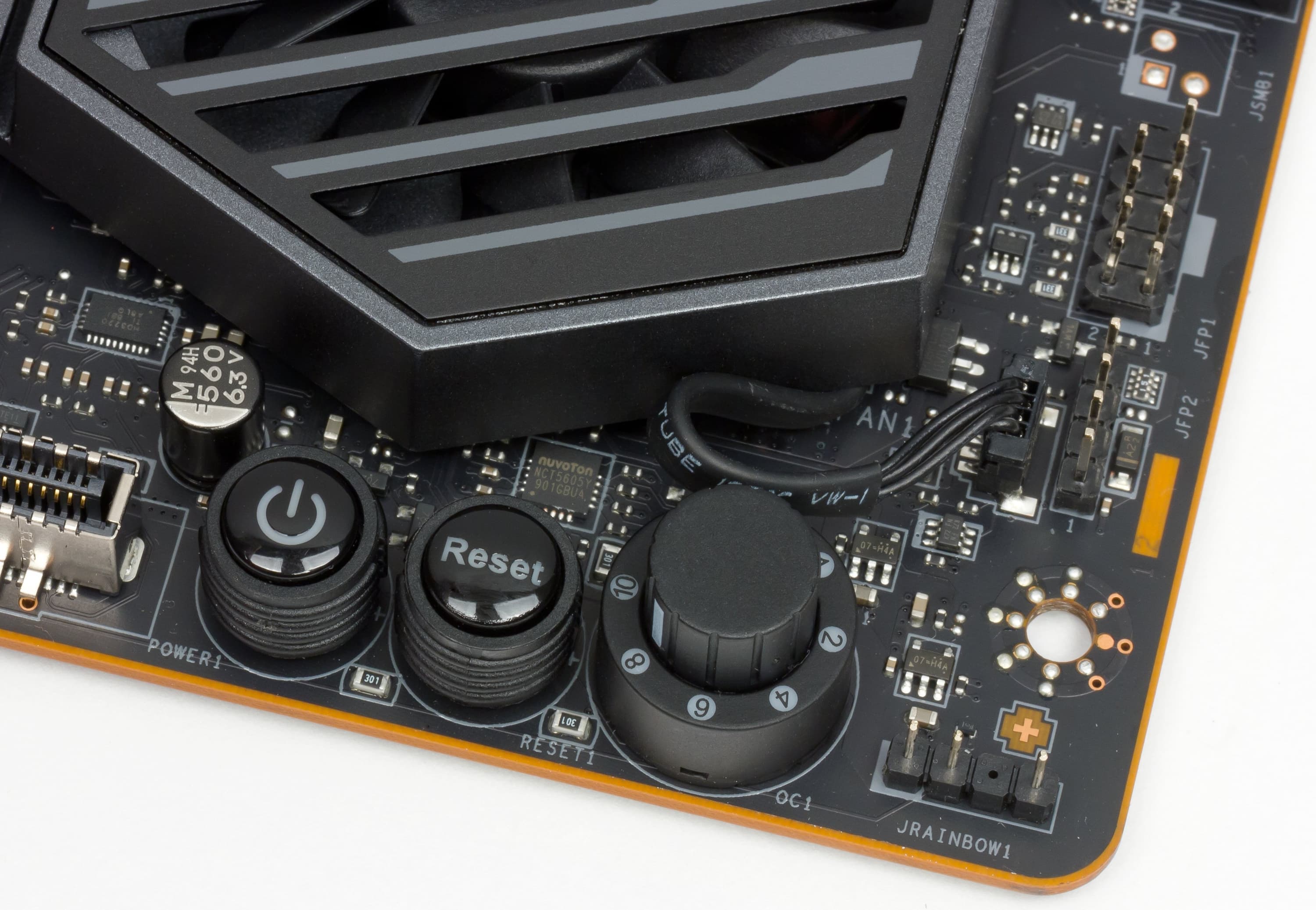 Понятно, что кнопки питания и перезагрузки комментировать нет смысла (просто бальзам на сердце для тестера, когда он видит такие «пипки» на материнке: нет нужды рыскать по мануалу — куда подключать проводки от Power и Reset). «Барабанчик» OC1, иначе называемый Game Boost, — включает предустановленные режимы разгона, мы об этом поговорим в соответствующем разделе. Я писал ранее при рассмотрении аналогичной материнки MSI, что как-то даже захотелось услышать звук механического этакого переключения «тррррыыык», однако «барабан» работает бесшумно.