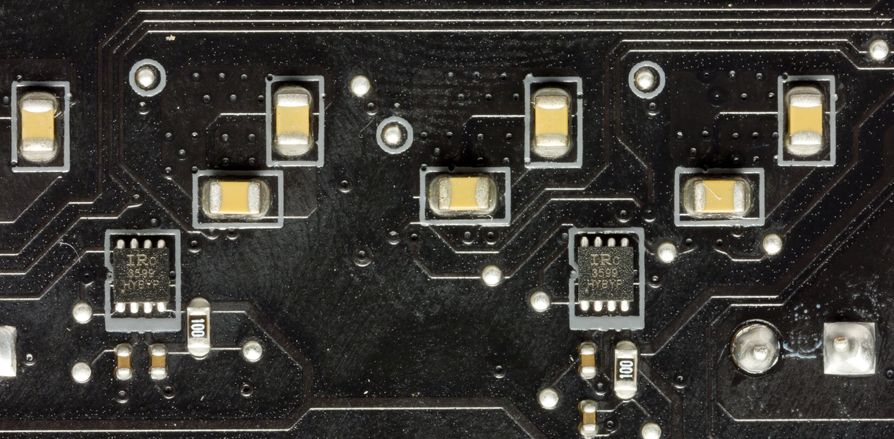 Так что имеем привычную уже хитрость. На оборотной стороне платы установлены удвоители IR3598, которые превращают реальные 6 фаз в 12. Короче, каждые 2 фазы работают зеркально.