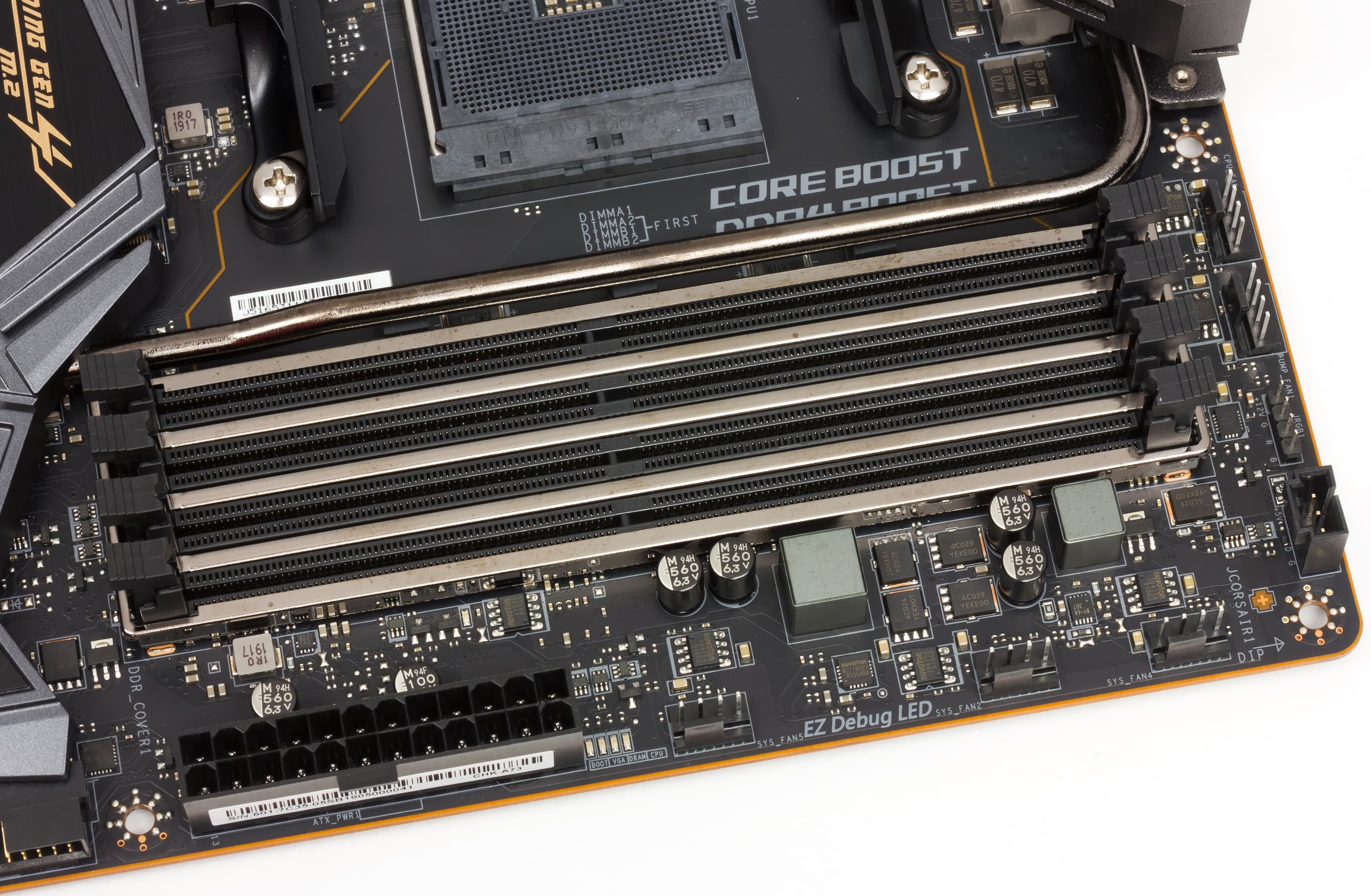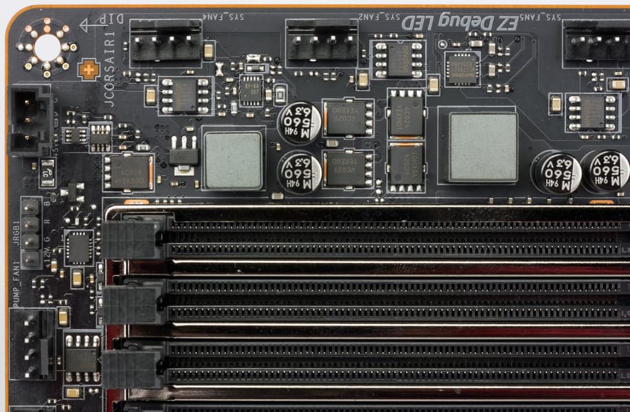 Слоты DIMM имеют защиту Steel Armor, улучшенную электроизоляцию (цепи модулей памяти изолированы целой полоской текстолита, что должно улучшить стабильность работы ОЗУ). Имеются дополнительные точки заземления и защита от перегрузки по току.