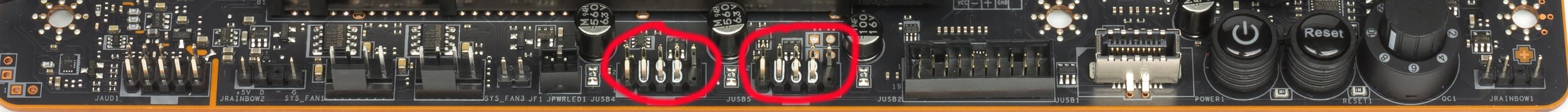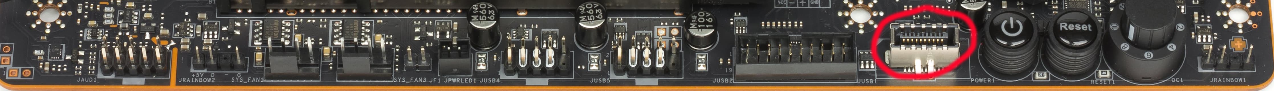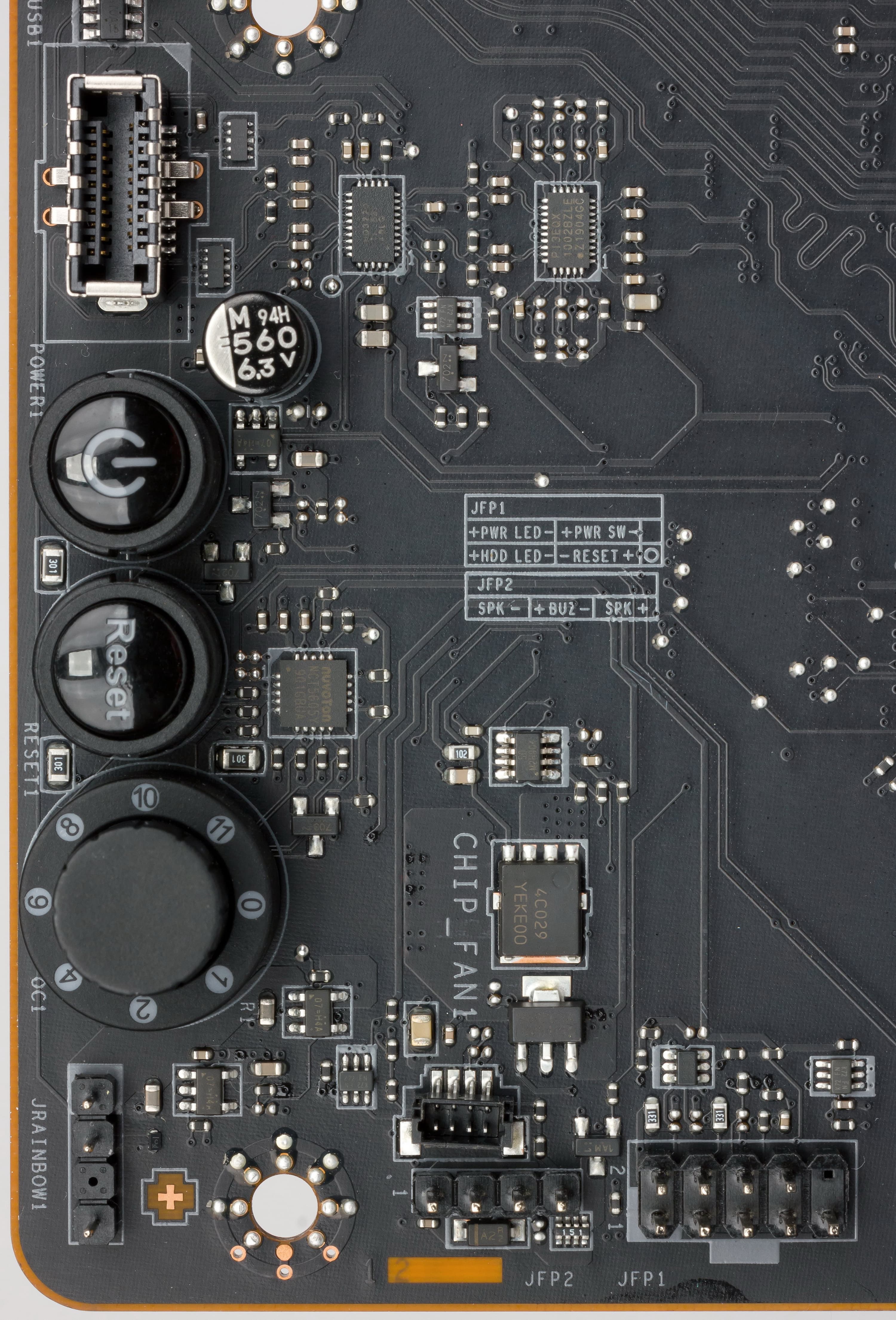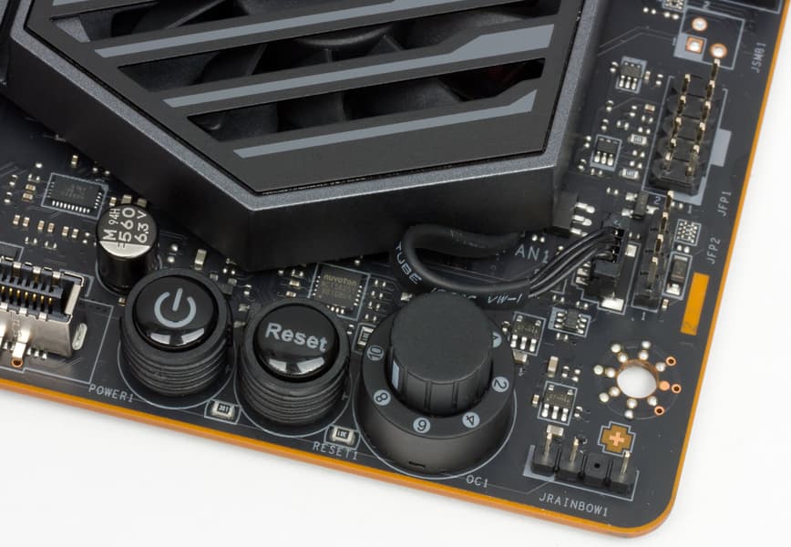 Если вдруг случился сбой из-за неверно выставленных параметров работы материнской платы, то для сброса настроек CMOS имеется физическая кнопка на задней панели (о ней позже). Также на картинке со слотами M.2 можно увидеть два пина JBAT1. Если их замкнуть, то получится тот же сброс CMOS.