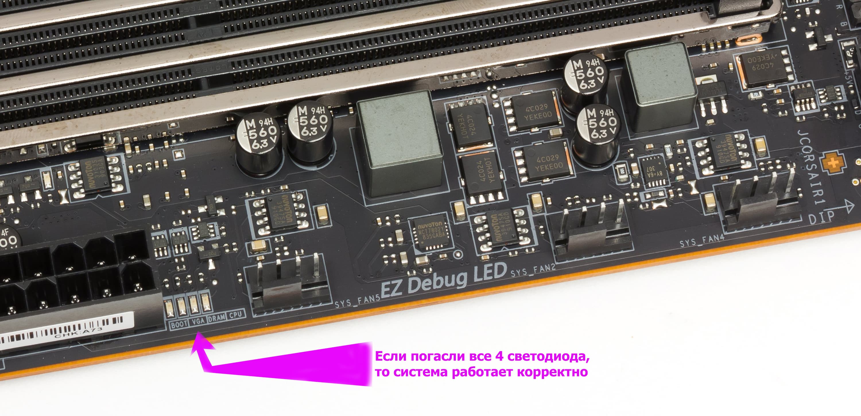 У материнской платы имеются световые индикаторы, сообщающие о проблемах с тем или иным компонентом системы. Если после включения компьютера к моменту перехода на загрузку ОС все индикаторы погасли, то проблем нет.