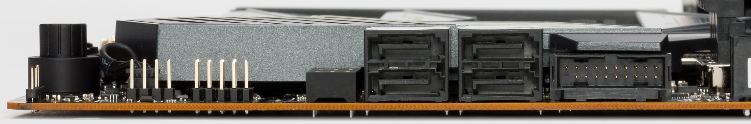 Всего у платы 4 разъема Serial ATA 6 Гбит/с + 3 слота для накопителей в форм-факторе M.2. (Еще один слот M.2, спрятанный под кожухом блока разъемов задней панели, занят контроллером беспроводных сетей Wi-Fi/Bluetooth.)