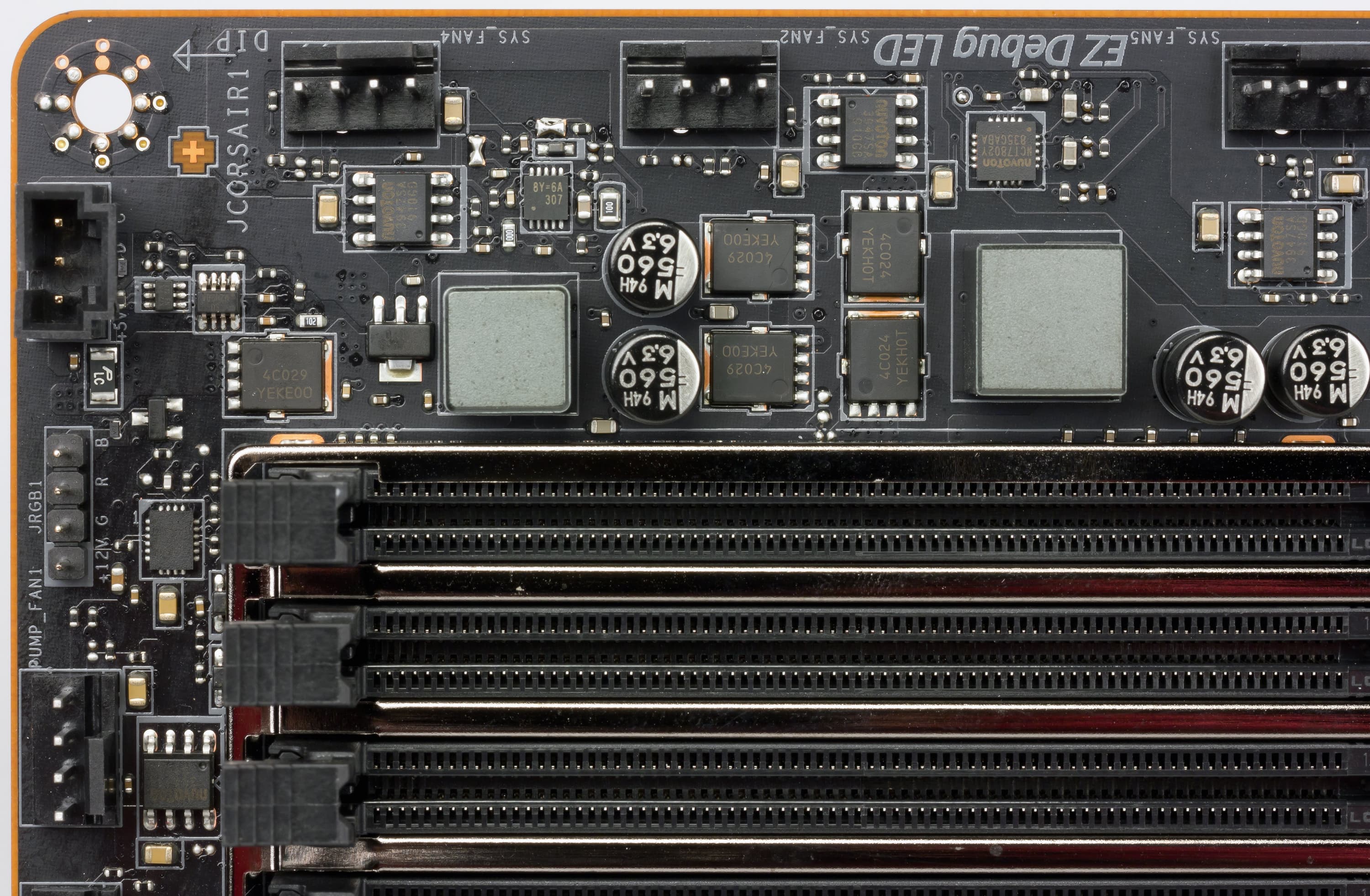 Теперь про блок ввода-вывода, разъемы для подключения вентиляторов и т. п. Мы имеем 7 разъемов для вентиляторов, при этом они хорошо распределены по периметру двух сторон платы. То есть не потребуется тянуть кабели от вентиляторов через всю материнку.