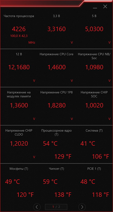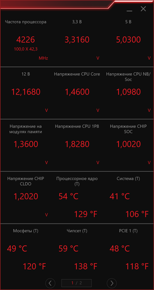 В результате получаем вот такое окно, которое можно переключать, если количество отмеченных в мониторинге элементов не умещается в нем. Это окно весьма удобно разместить где-то сбоку для удобства просмотра ситуации с «железом», например, в случае разгона или серьезной нагрузки в игре. Правда тогда придется отказаться от режима «полного экрана» в той же игре. В режим On-Screen-Display (OSD) окно мониторинга не переключается.