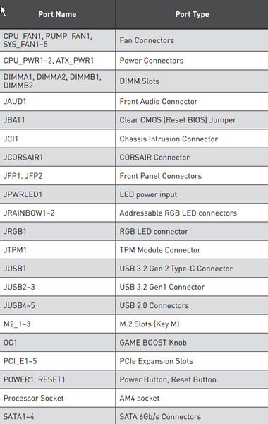 | USB-порты | 3 × USB 3.2 Gen2: 2 порта Type-A (темно-красные) на задней панели + 1 внутренний порт Type-C (X570) 6 × USB 2.0: 2 порта Type-A (черные) на задней панели + 2 внутренних разъема на 4 порта (X570) 4 × USB 3.2 Gen1: 2 внутренних разъема, каждый на 2 порта (X570) 2 × USB 3.2 Gen1: 2 порта Type-A (красные) на задней панели (CPU) 2 × USB 3.2 Gen2: 1 порт Type-C + 1 порт Type-A (красный) на задней панели (CPU Ryzen 3xxx) или 2 × USB 3.2 Gen1: 1 порт Type-C + 1 порт Type-A (красный) на задней панели (CPU Ryzen 2xxx) |