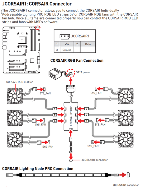 В руководстве пользователя написано, как подключать RGB-устройства Corsair, включая их хабы для вентиляторов.