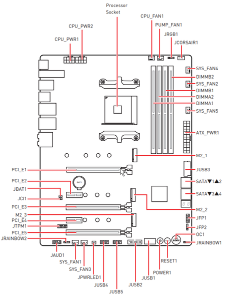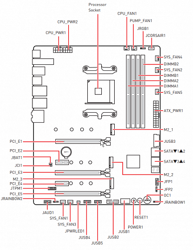 Если уж мы заговорили о световых индикаторах, то надо упомянуть и возможности материнской платы по подключению RGB-подсветки. Имеется три разъема для подключения любых устройств этого плана: 2 разъема для подключения адресуемых (5 B 3 A, до 15 Вт) RGB-лент/устройств, 1 разъем неадресуемых (12 В 3 А, до 36 Вт) RGB-лент/устройств. Сверху на плате имеется неадресуемый разъем 12 В. Компания MSI очень активно сотрудничает с Corsair, поэтому для их элементов подсветки есть специальный проприетарный разъем (он рядом с JRGB1).