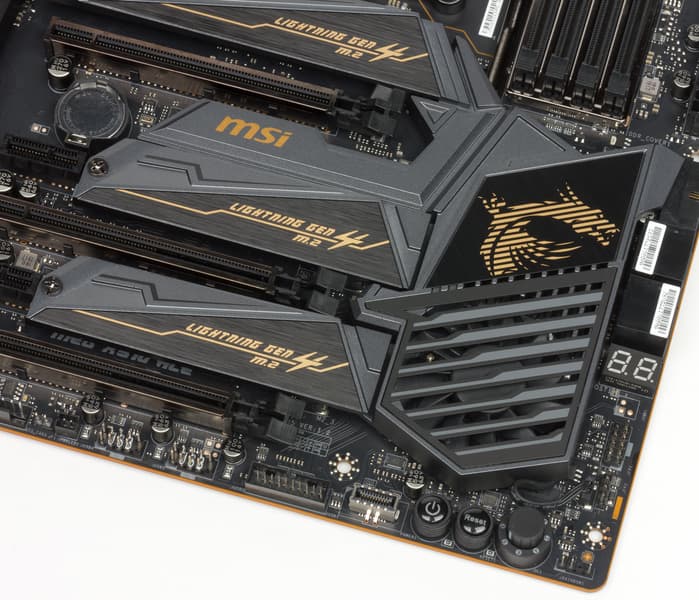 Все потенциально сильно греющиеся элементы имеют свои собственные радиаторы. Как известно, самым горячим звеном в наборе AMD X570 является сам чипсет, поэтому многие производители вынуждены вспомнить про вентиляторы для такого рода микросхем (до того все топовые десктопные продукты (не HEDT) обходились простыми радиаторами).