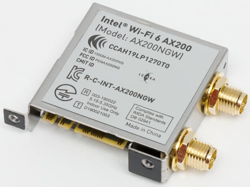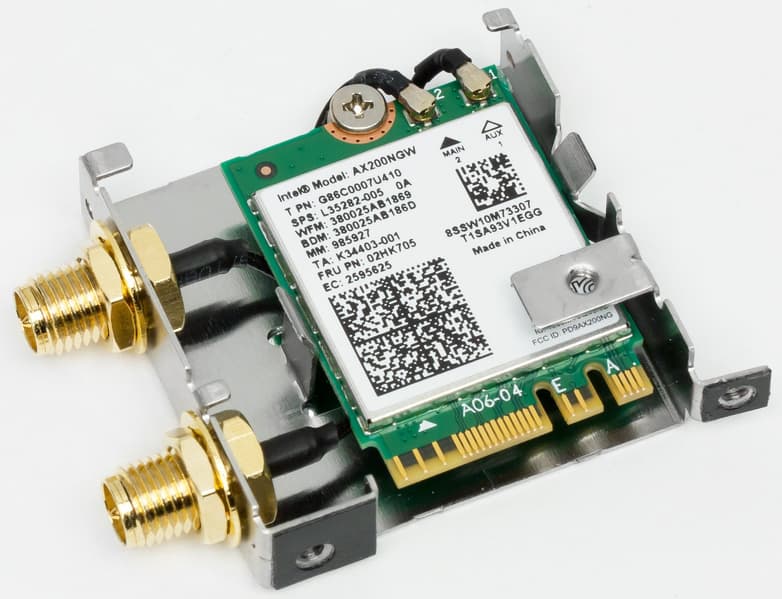 Имеется и комплексный беспроводной адаптер на контроллере Intel AX-200NGW, через который реализованы Wi-Fi 6 и Bluetooth 5.0. Он установлен в слот M.2 (E-key), и его разъемы для привинчивания выносных антенн выведены на заднюю панель.