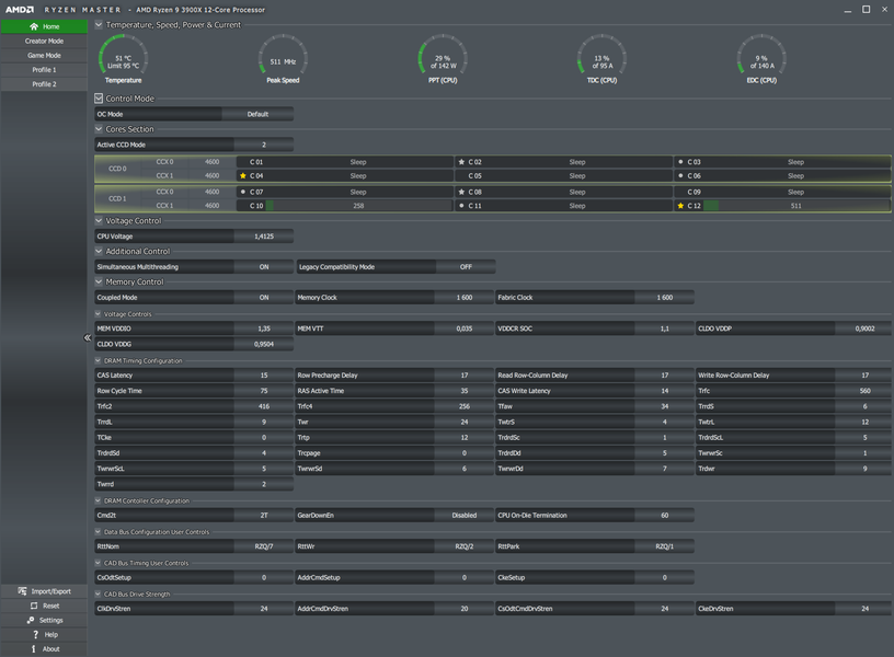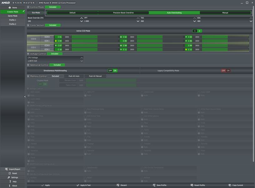 Ryzen Master предлагает два основных режима использования процессора, и в зависимости от них выставляет нужные параметры работы CPU: Creator Mode и Game Mode. Желающие экспериментов могут создать свои профили и пресеты.