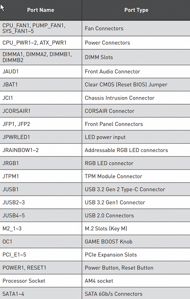 | Прочие внутренние элементы | 24-контактный разъем питания ATX 2 8-контактных разъема питания ATX12V 1 слот M.2 (E-key), занят адаптером беспроводных сетей 1 разъем для подключения порта USB 3.2 Gen2 Type-C 2 разъема для подключения 4 портов USB 3.2 Gen1 2 разъема для подключения 4 портов USB 2.0 7 разъемов для подключения 4-контактных вентиляторов (поддержка помп ЖСО) 1 разъем для подключения неадресуемой RGB-ленты 2 разъема для подключения адресуемой ARGB-ленты 1 разъем для подключения RGB-подсветки от Corsair 1 разъем аудио для передней панели корпуса 1 разъем TPM 2 разъема для подключения управления с передней панели корпуса 1 кнопка включения питания (Power) 1 кнопка перезагрузки (Reset) 1 переключатель режимов разгона (Game Boost) 1 перемычка сброса CMOS 1 разъем сигнала открытого корпуса системного блока |