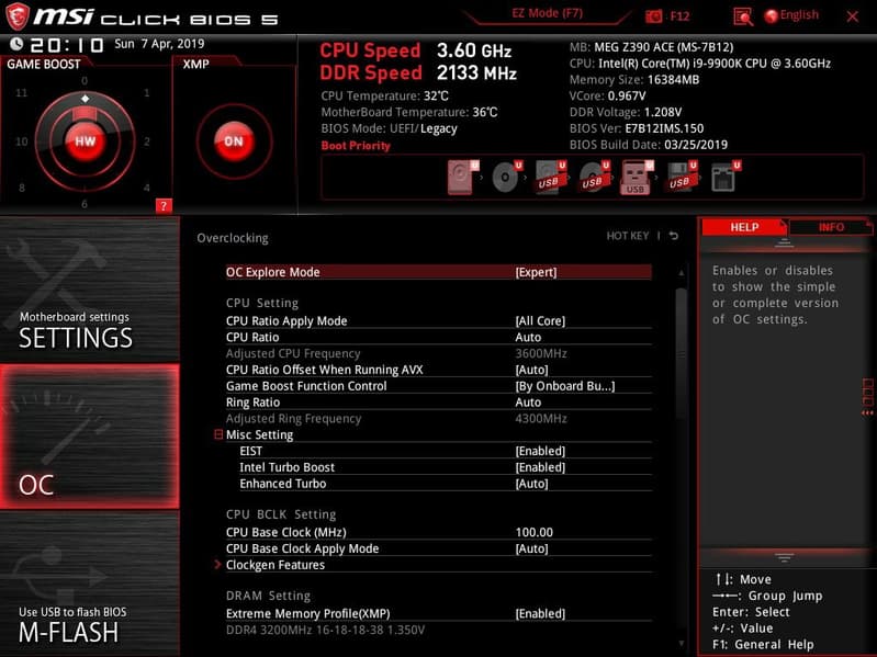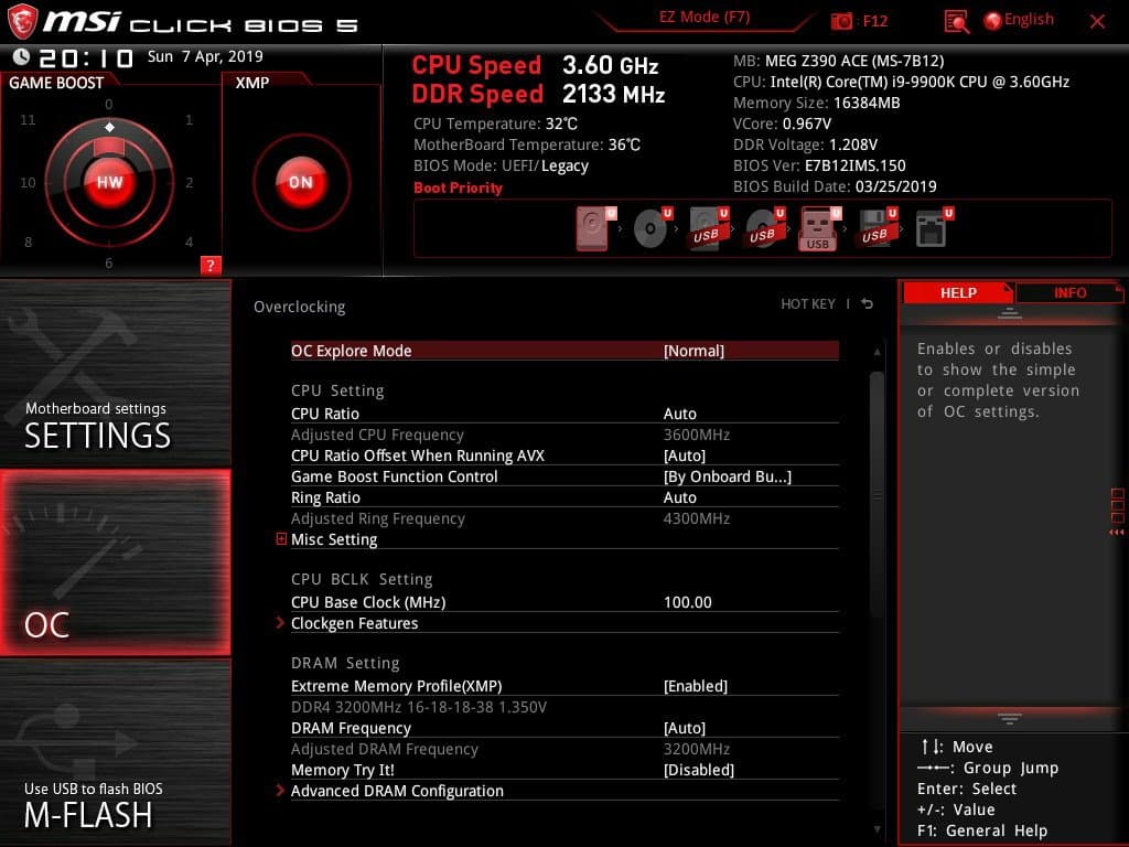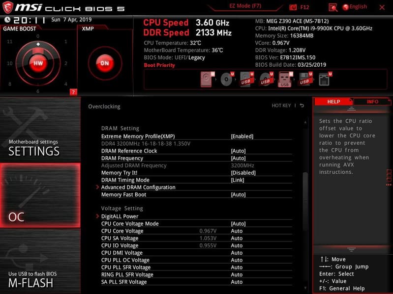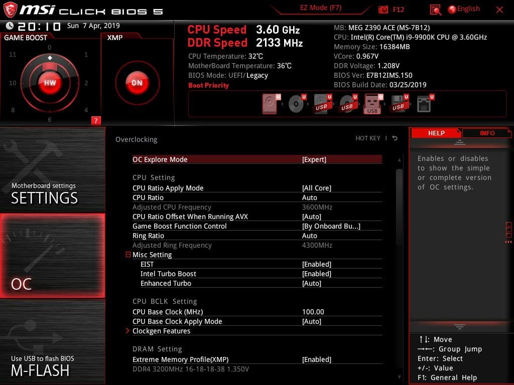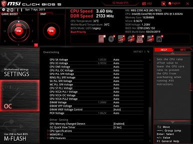 По умолчанию система предлагает «простое» меню для тонкой настройки, но можно нажать F7 и попасть в «продвинутое» меню (о нем позже). Как мы видим, по умолчанию профиль XMP (работа ОЗУ на повышенных частотах) выключен. «Барабан» Game Boost выставлен на управление самим переключателем (физически).