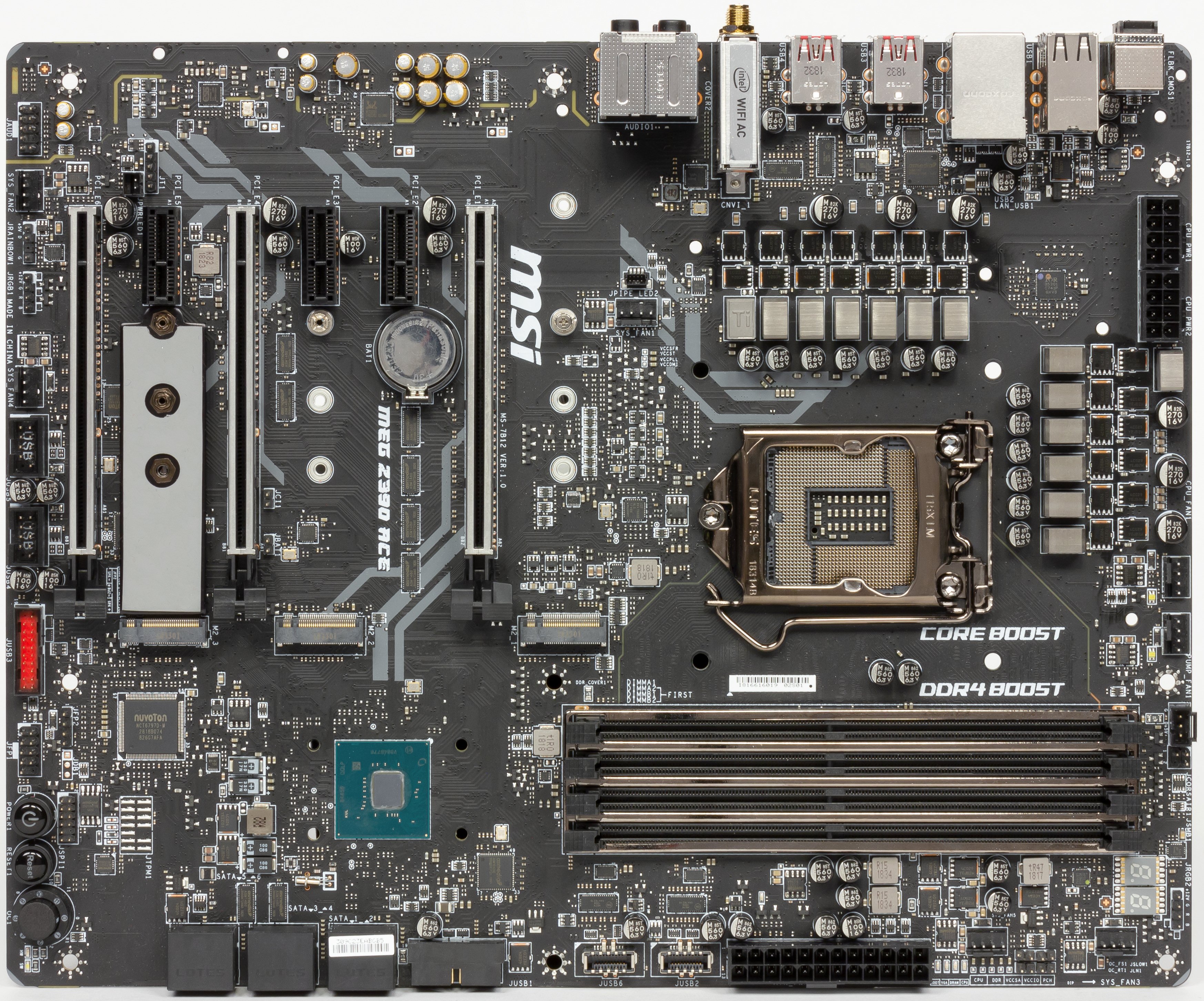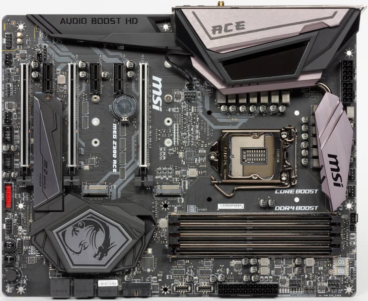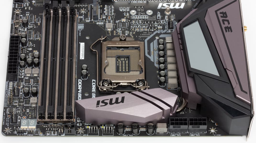 Еще раз надо напомнить, что MSI MEG Z390 Ace поддерживает процессоры Intel Core 8-го и 9-го поколений, выполненные под разъем (сокет) LGA1151v2. Хотя физически отличий от старого LGA1151 нет, старые процессоры в LGA1151 v2 работать не будут. Поэтому еще раз напомню: только модели с индексами 8000 и 9000!