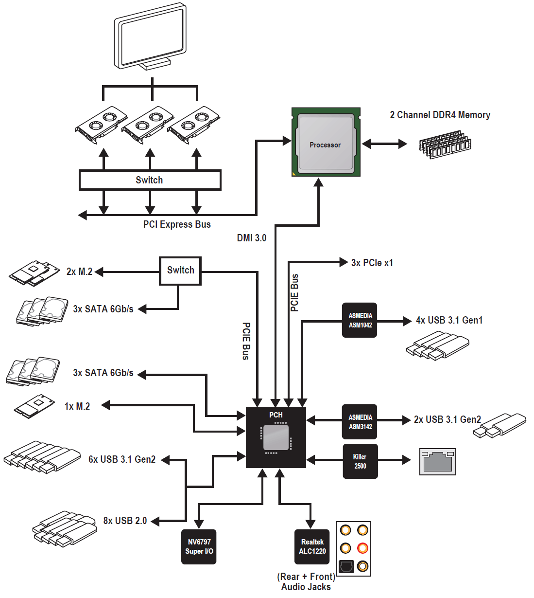 У процессора есть 16 линий PCI-E 3.0, они идут только на слоты PCI-E x16, но для трех «длинных» слотов этого недостаточно. Вот так выглядит схема распределения: