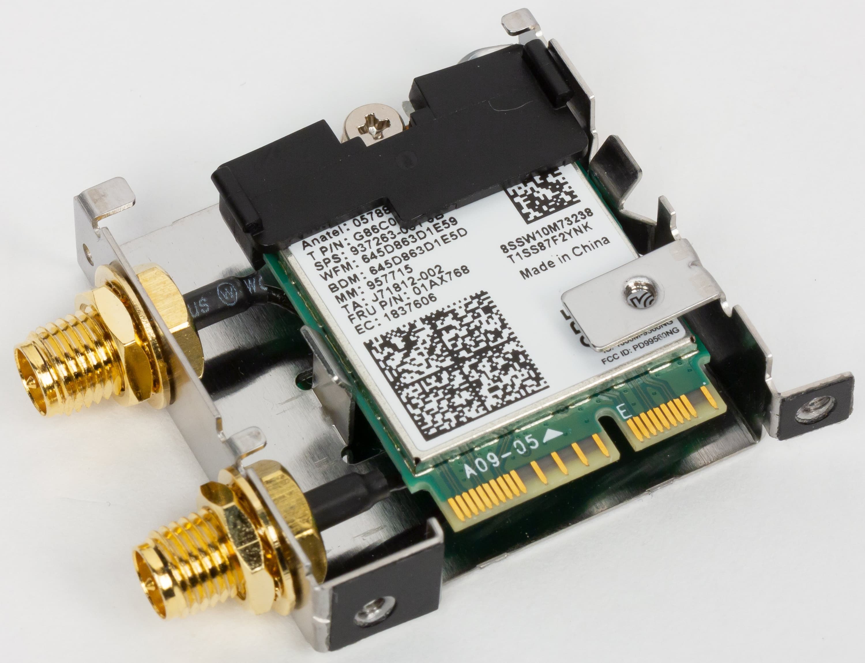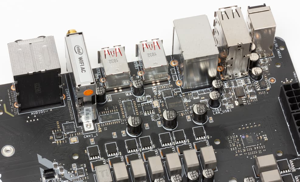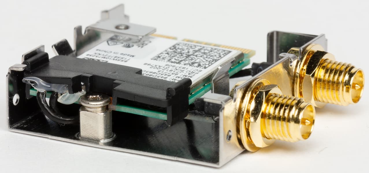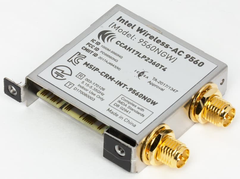 Беспроводные адаптеры Wi-Fi 802.11a/b/g/n/ac и Bluetooth 5.0 реализованы на контроллере Intel AC-9560. Он установлен в слот M.2 (E-key), и его разъемы для привинчивания выносных антенн выведены на заднюю панель.