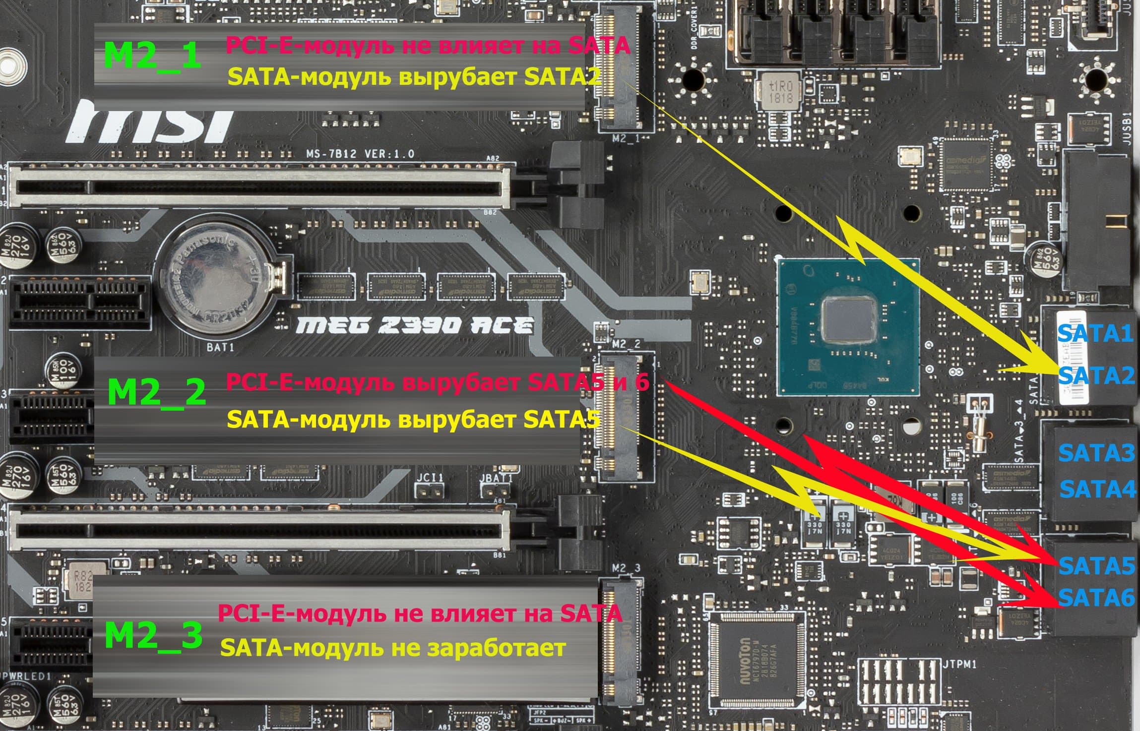 Портов ввода-вывода у чипсета на всех не хватает, поэтому традиционно приходится делить аппаратные ресурсы между устройствами. У данной платы слот M2_1 (верхний) в случае использования накопителя SATA делит линии с портом SATA2 (а если используется накопитель PCI-E, то никаких «дележек» нет) . Слот М2_2 делит линии уже в обоих случаях: если используем накопитель PCI-E, то вырубаются сразу оба SATA5 и SATA6, а если используем накопитель M.2 SATA, то вырубится SATA5. Самый нижний слот М2_3 поддерживает только PCI-E-накопители и не делит ресурсы. То есть читатели поняли, что, например, если мы подключили жесткий диск или SSD к порту SATA5, то в М2_2 слот вставлять накопители бесполезно: не заработает ни c PCI-E интерфейсом, ни с SATA. И наоборот: если чем-то заняли слот M.2_2, то порт SATA5 будет банально отключен.