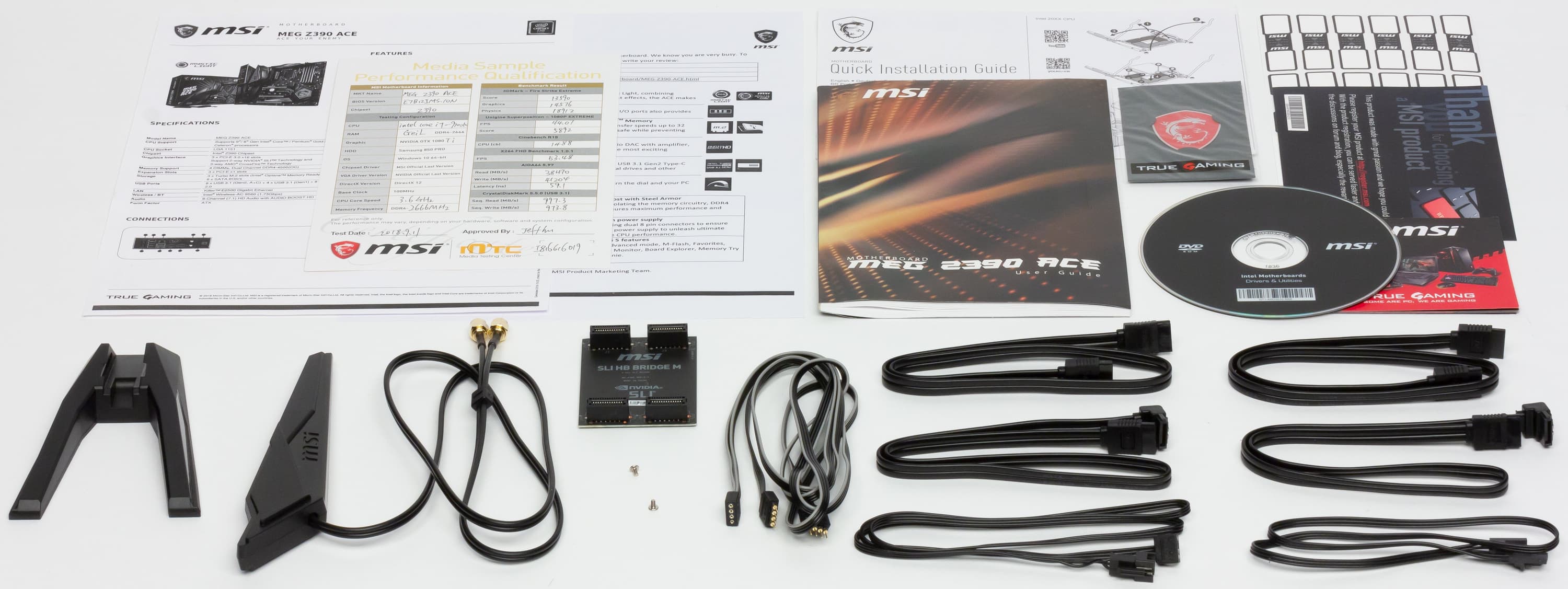 Комплект поставки, кроме традиционных элементов типа руководства пользователя, диска и кабелей SATA (что уже много лет является обязательным набором ко всем материнкам), есть выносная антенна с подставкой для беспроводных соединений, разветвители для подключения подсветки, винтики для монтажа модулей M.2, бонусные стикеры и наклейки и адаптер Nvidia SLI.