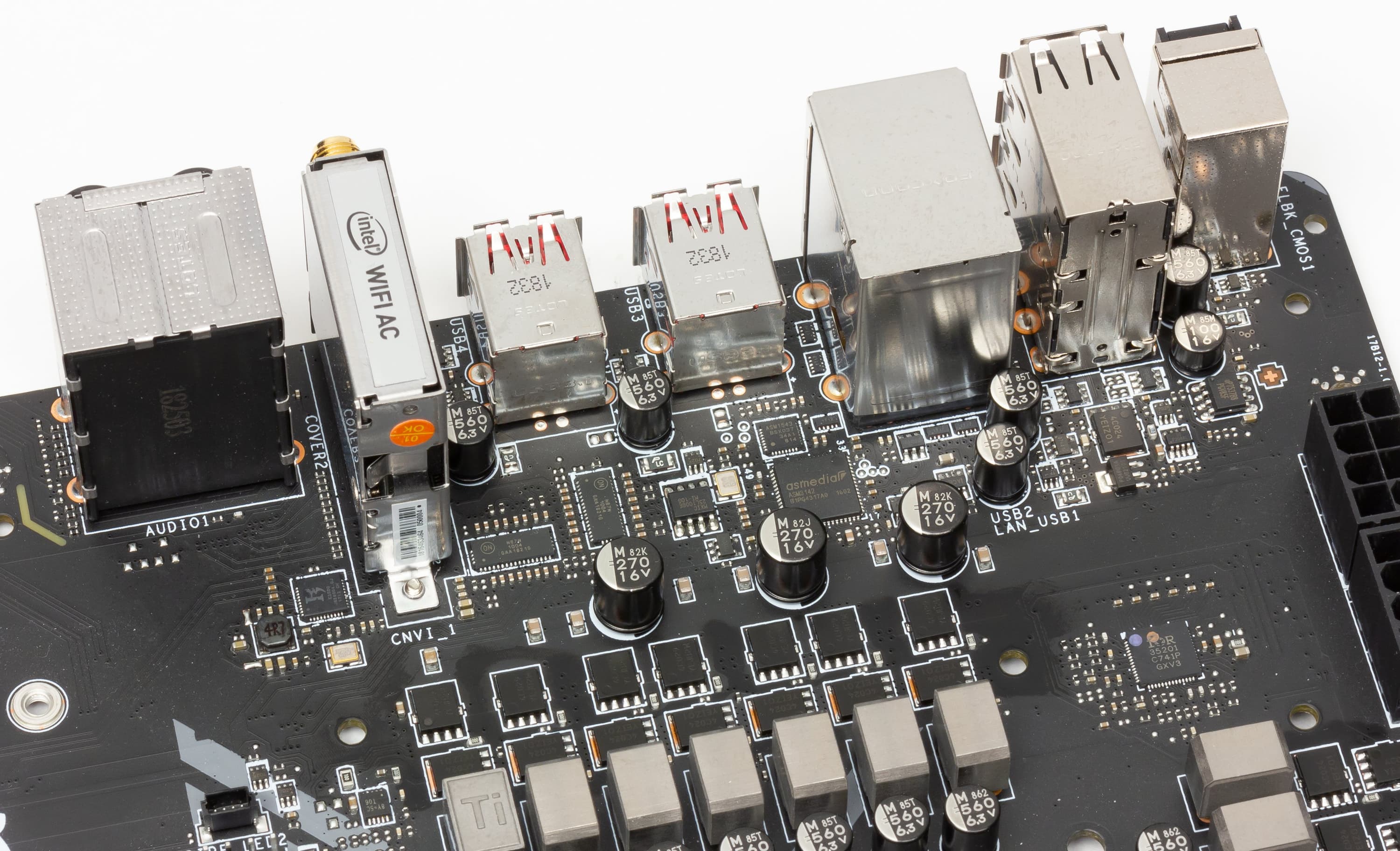 - 2 порта USB 3.1 Gen2: реализованы через контроллер ASMedia ASM3142 и представлены 1 разъемом Type-A и 1 разъемом Type-C на задней панели (обведены красным);