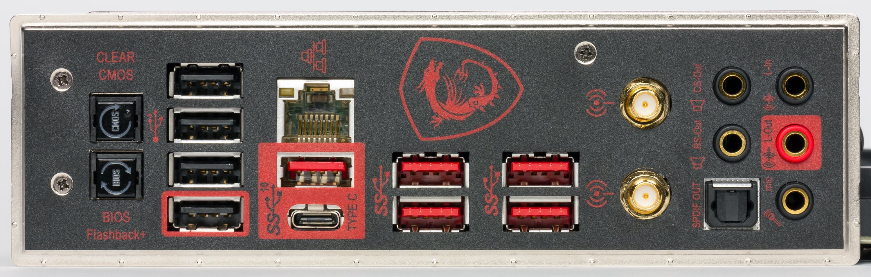 | Разъемы на задней панели | 1 × USB 3.1 Gen2 (Type-C) 5 × USB 3.1 Gen2 (Type-A) 4 × USB 2.0 (Type-A) 1 x RJ-45 5 аудиоразъемов типа миниджек 1 × S/PDIF (оптический, выход) 2 антенных разъема кнопка сброса CMOS кнопка перепрошивки BIOS — Flashback+ |