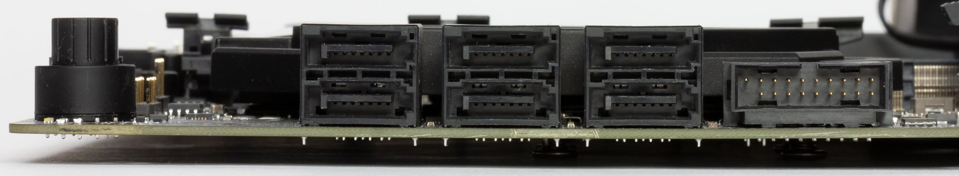 Всего у платы 6 разъемов Serial ATA 6 Гбит/с + 3 слота для накопителей в форм-факторе M.2. (Еще один слот M.2, спрятанный под кожухом блока разъемов задней панели, занят контроллером беспроводных сетей Wi-Fi/Bluetooth.)
