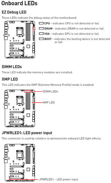 Кстати, у платы есть не только эти индикаторы. У слотов памяти есть свои светодиоды, извещающие о том, какие слоты заняты модулями. А включенный профиль XMP имеет свой индикатор.