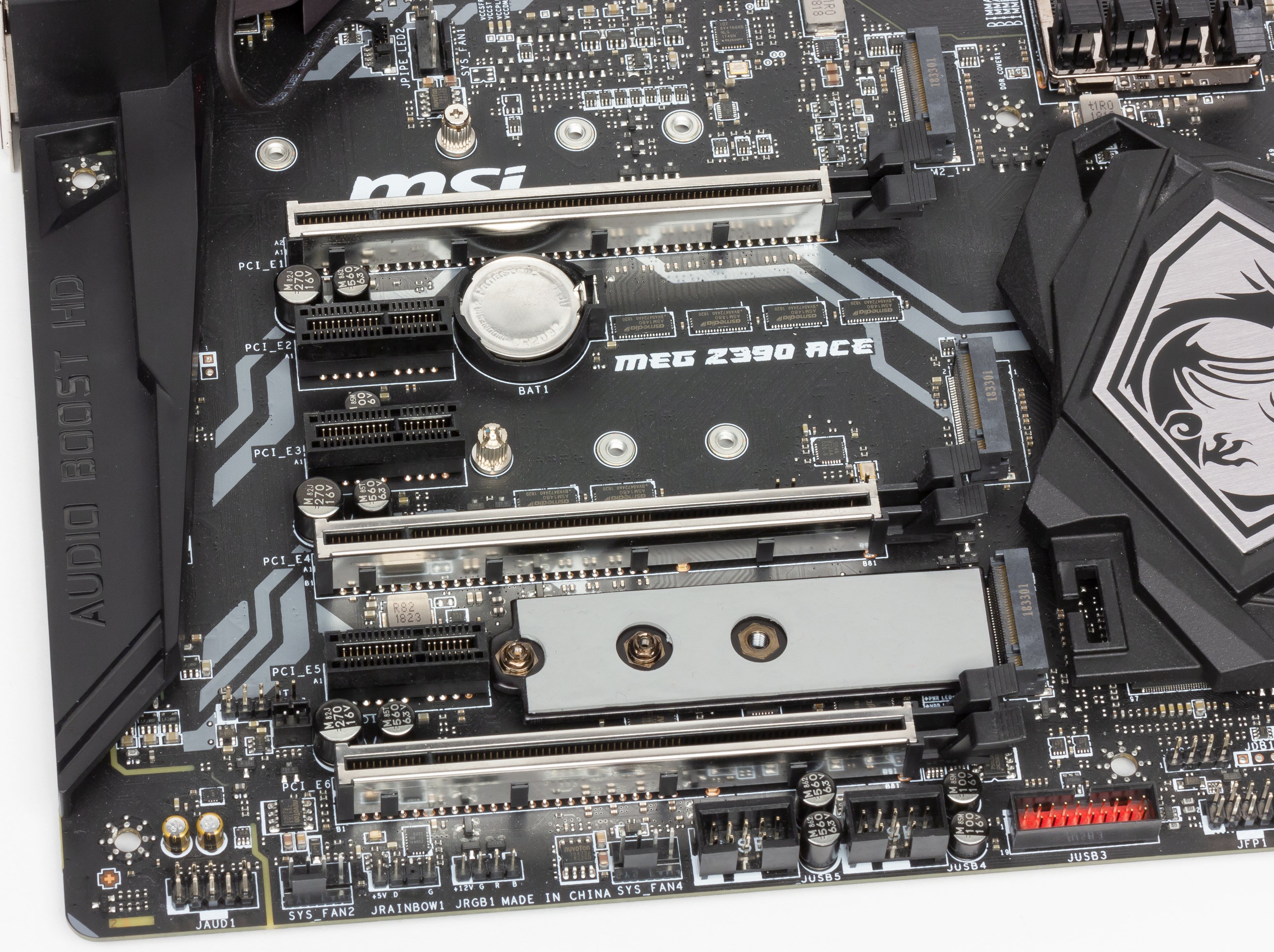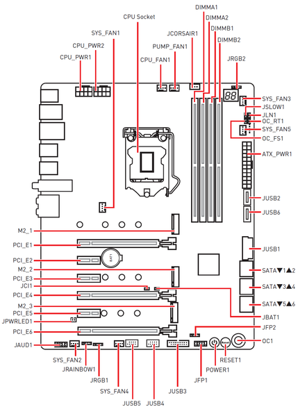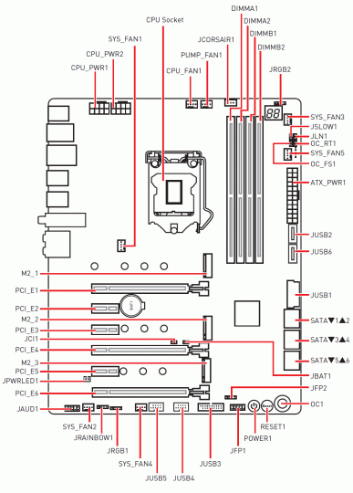 - 8 портов USB 2.0/1.1 реализованы через Z390 и представлены 4 портами Type-A (черного цвета) на задней панели и 2 внутренними портами. Порт JUSB3 помечен красным цветом, так как именно он поддерживает быструю зарядку устройств (регулируется в BIOS Setup и активируется соответствующим приложением).