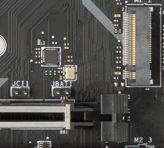 А если разгон или аура сердитой жены вдруг отправили систему в «нирвану», можно воспользоваться перемычкой JBAT1 для очистки CMOS, чтобы вернуть компьютер «с небес на землю». Для этой же цели есть и физическая кнопка на задней панели (о ней позже). Слева — перемычка JCI1, вернее, разъемчик для подключения сигнализации с корпуса об открытой дверце (для тех, у кого есть такая на корпусе).
