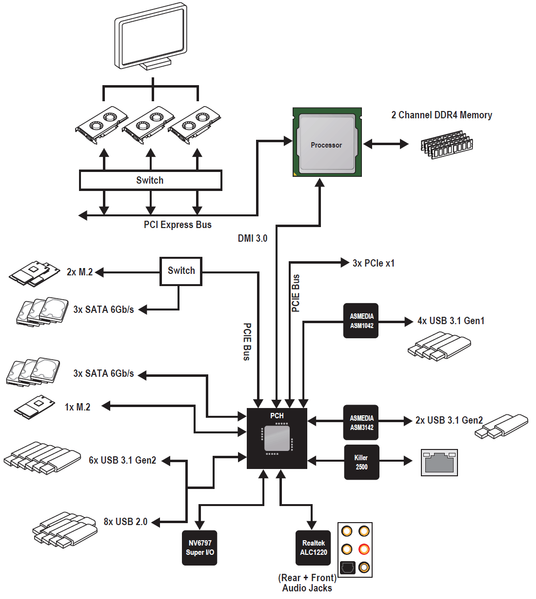 | Разъемы для накопителей | 6 × SATA 6 Гбит/с (Z390) 3 × M.2 (Z390, для 1 устройства формата 2242/2260/2280/22110 и 2 устройств формата 2242/2260/2280) |