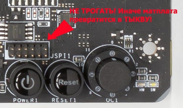 Секретный разъем JSPI1 лучше не трогать. Он поэтому нигде не задокументирован. По секрету скажу — это для подключения программатора, чтобы прошить BIOS в случае «запарывания» текущего.