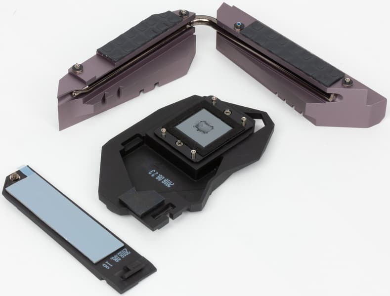 Для третьего (нижнего) слота M.2 предусмотрен радиатор с термоинтефейсом. Мне лично показалось это странным решением, потому как обычно все же радиатор если уж и устанавливают, то на самый «длинный» слот M.2. Бывает и так, что попадется сильно нагревающийся накопитель, но 22110, а там радиатора нет.